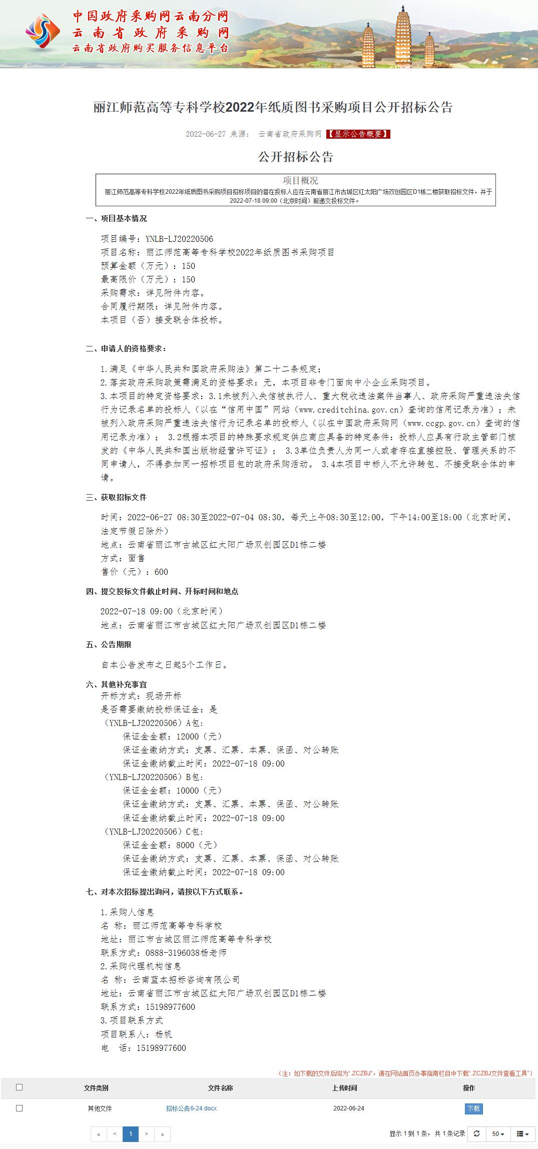 丽江师范高等专科学校2022年纸质图书采购项目公开招标公告