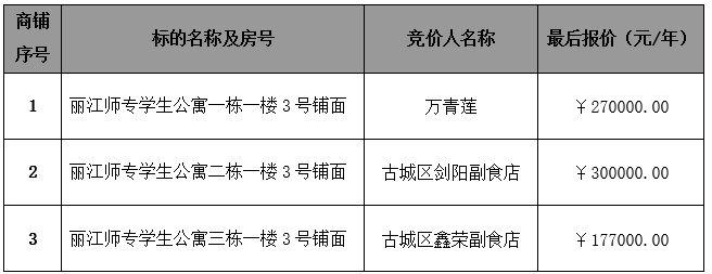 丽江师范高等专科学校2022年学生公寓商铺招租项目(二次)(项目编号:YDZOF20221539)的公开竞价已于2023年2月7日完成,各铺面根据竞价报价最高者得的原则,向出租方推荐1名竞价成交人。经招租人确认,现对成交情况公布如下: