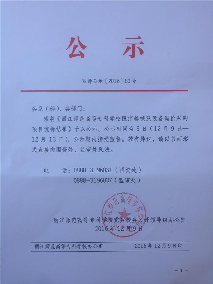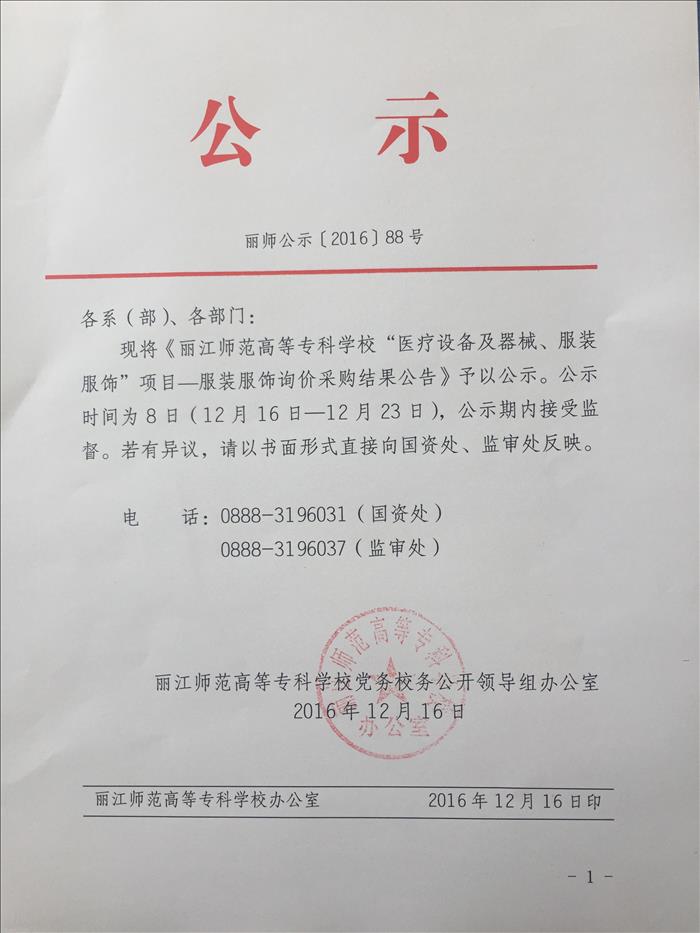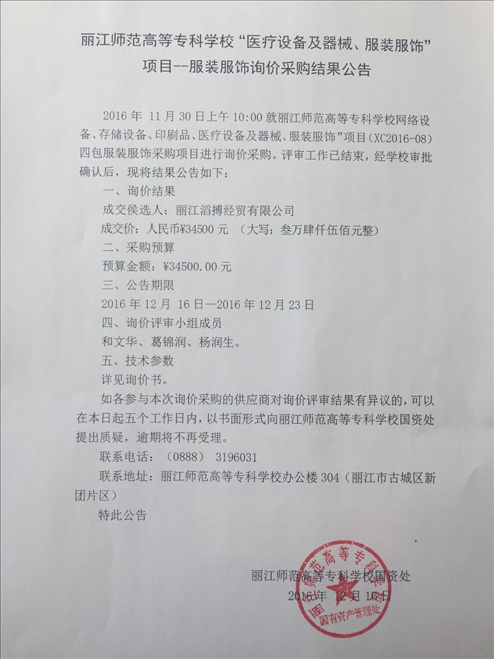 丽江师范高等专科学校“医疗设备及器械、服装服饰”项目——服装服饰询价采购结果公告