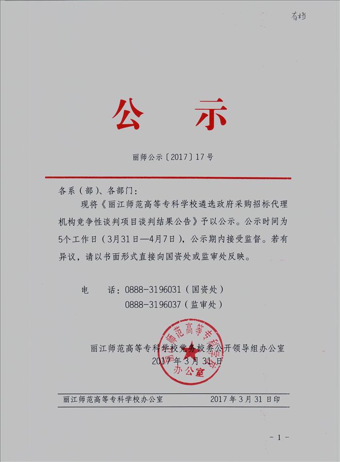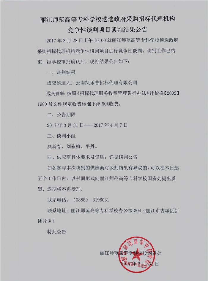 丽江师范高等专科学校遴选政府采购招标代理机构竞争性谈判项目结果公告