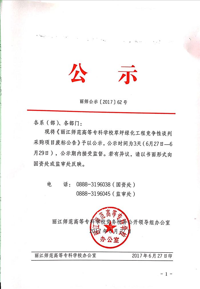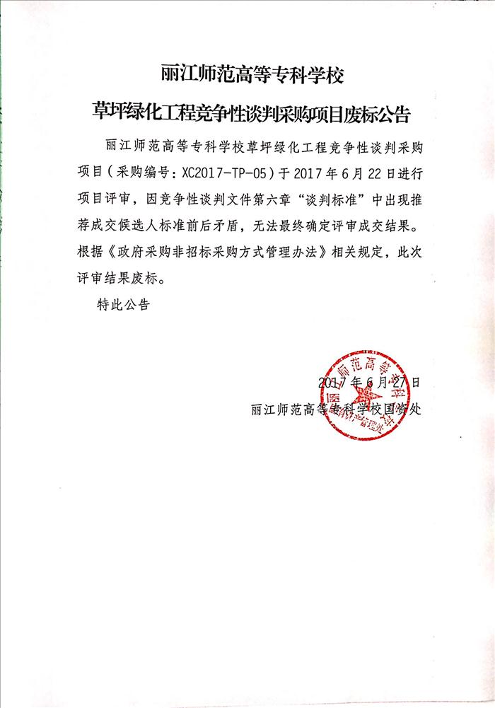 丽江师范高等专科学校草坪绿化工程竞争性谈判采购项目废标公告