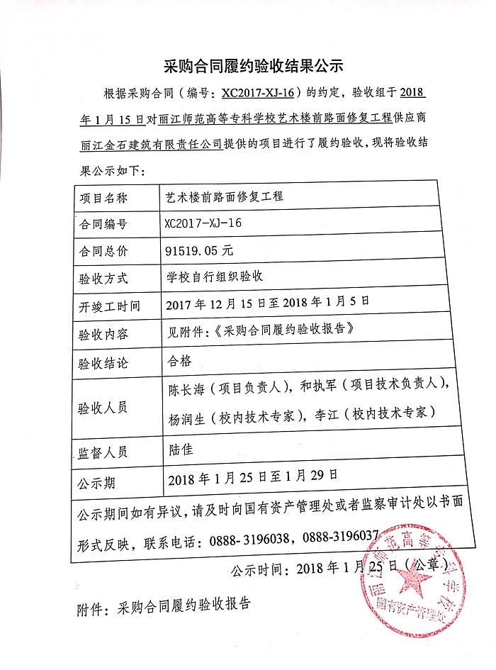 丽江师范高等专科学校艺术楼前路面修复工程采购合同履约验收结果公告