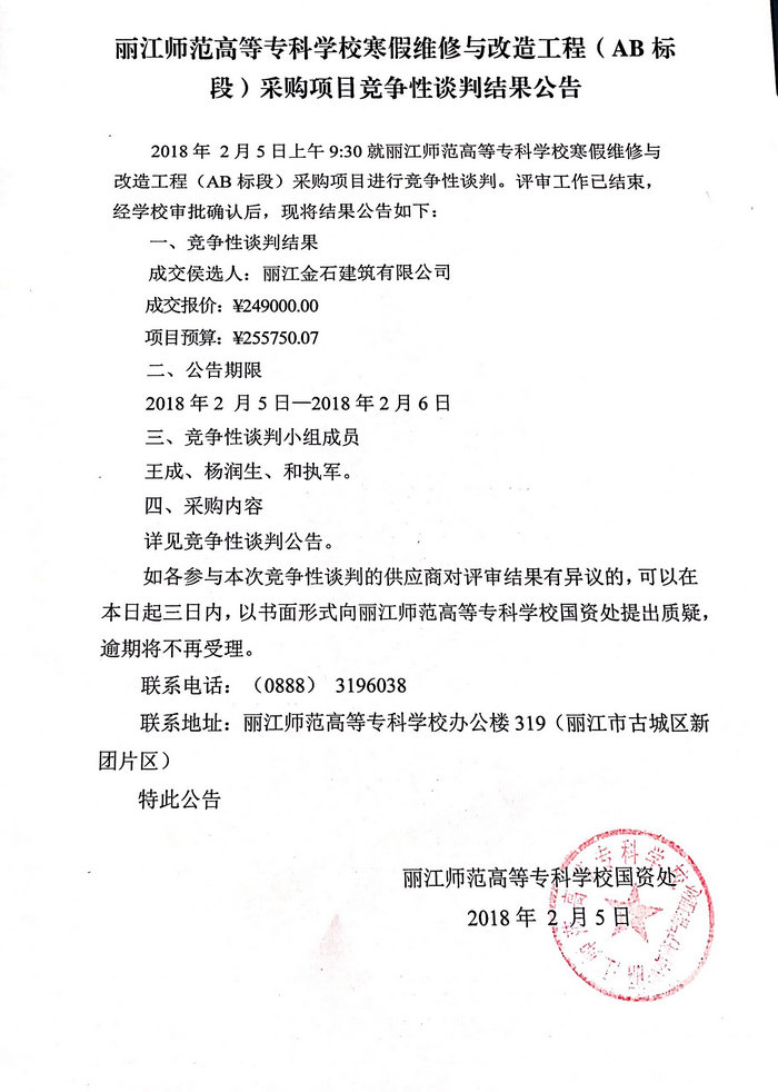 丽江师范高等专科学校寒假维修与改造工程采购项目(AB标段)竞争性谈判结果公告