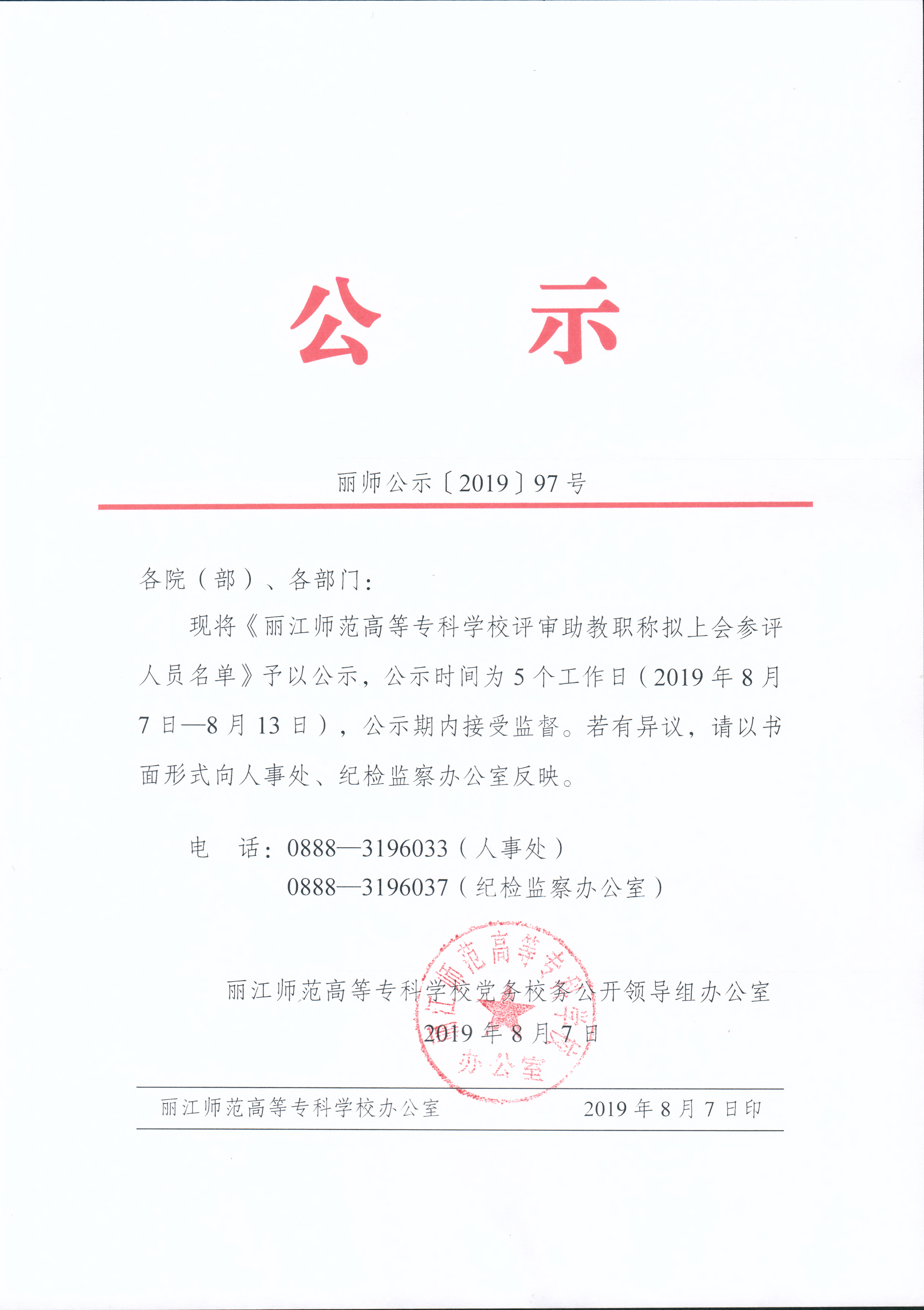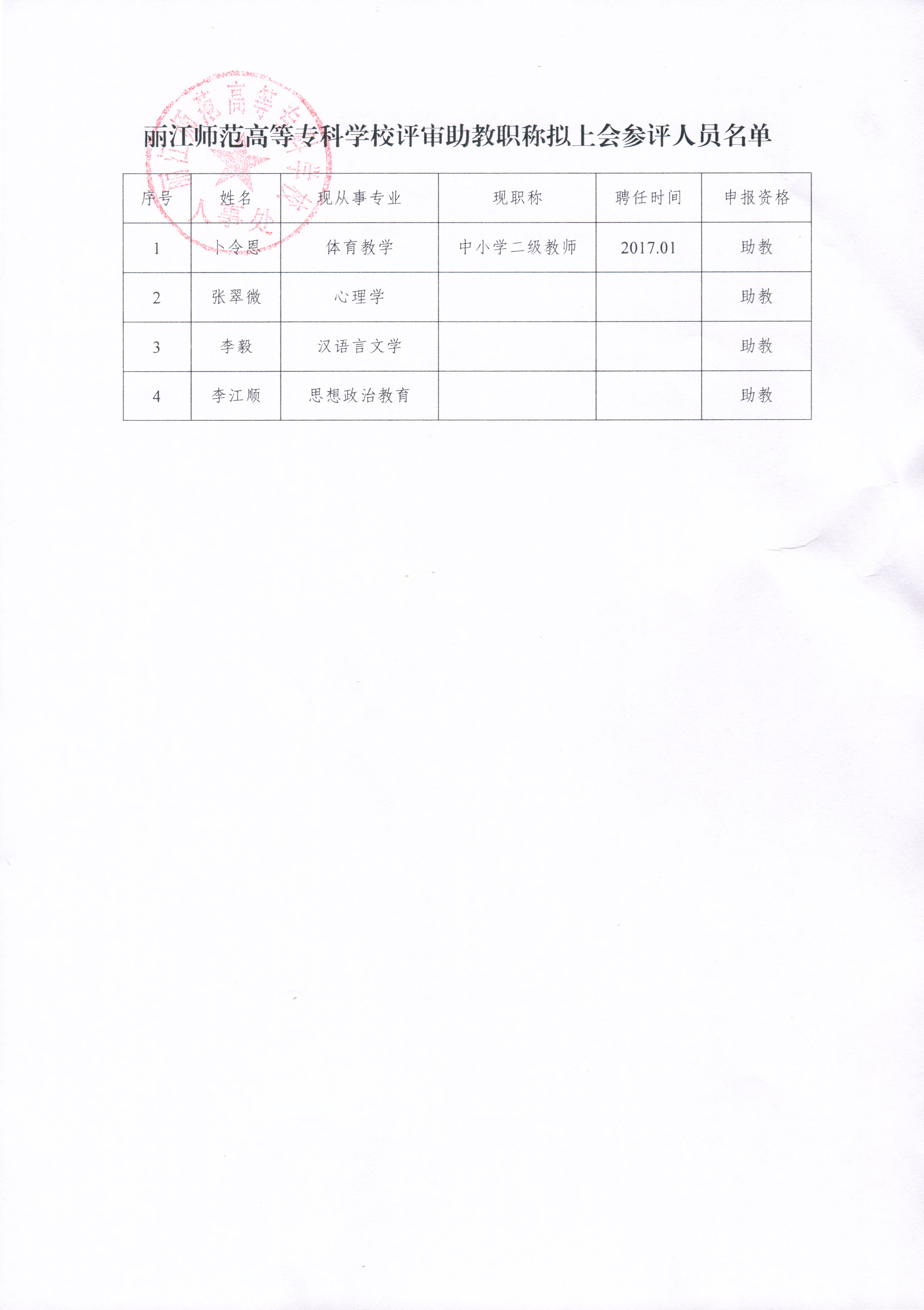 丽江师范高等专科学校评审助教职称拟上会参评人员名单