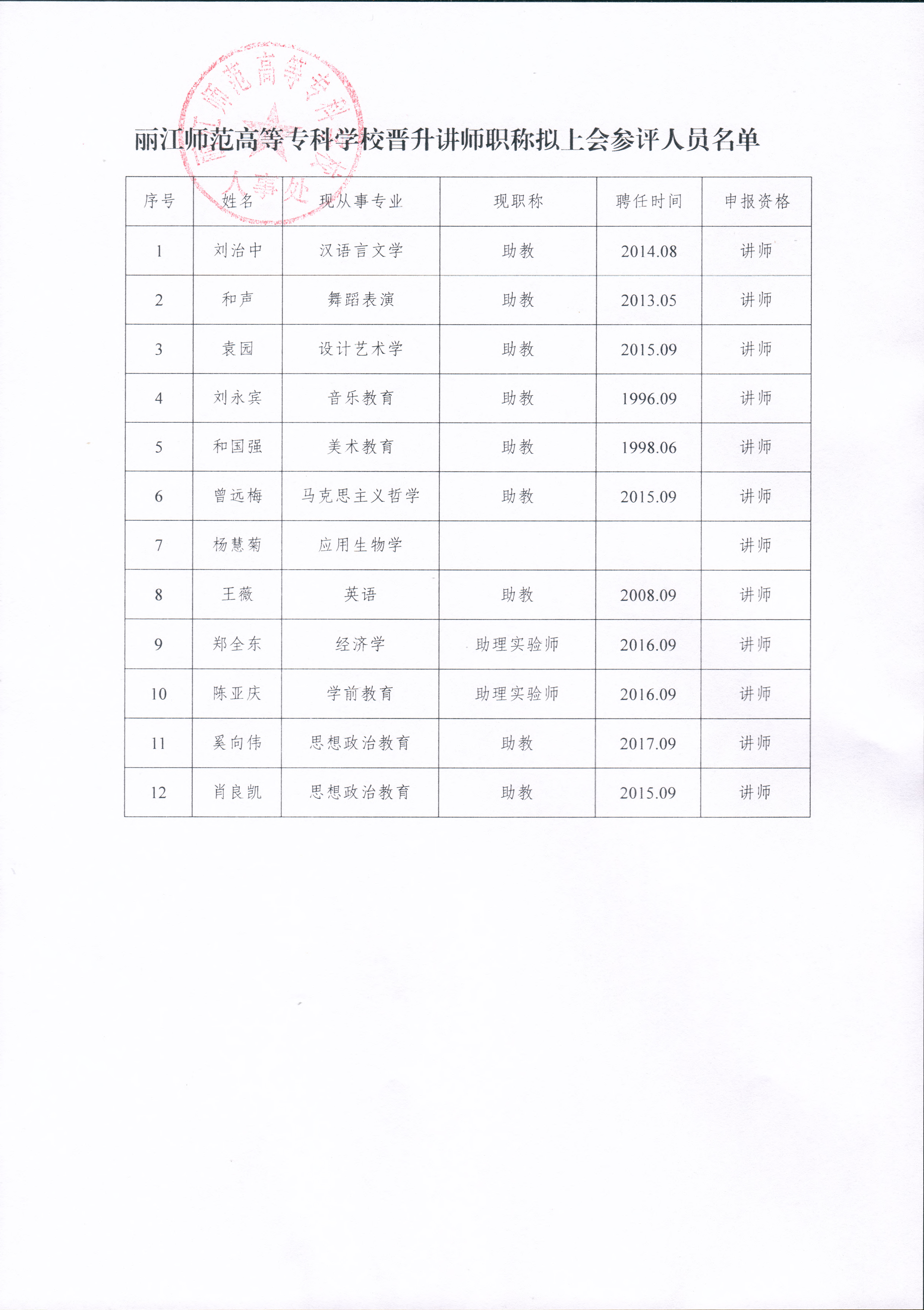 丽江师范高等专科学校评审助教职称拟上会参评人员名单