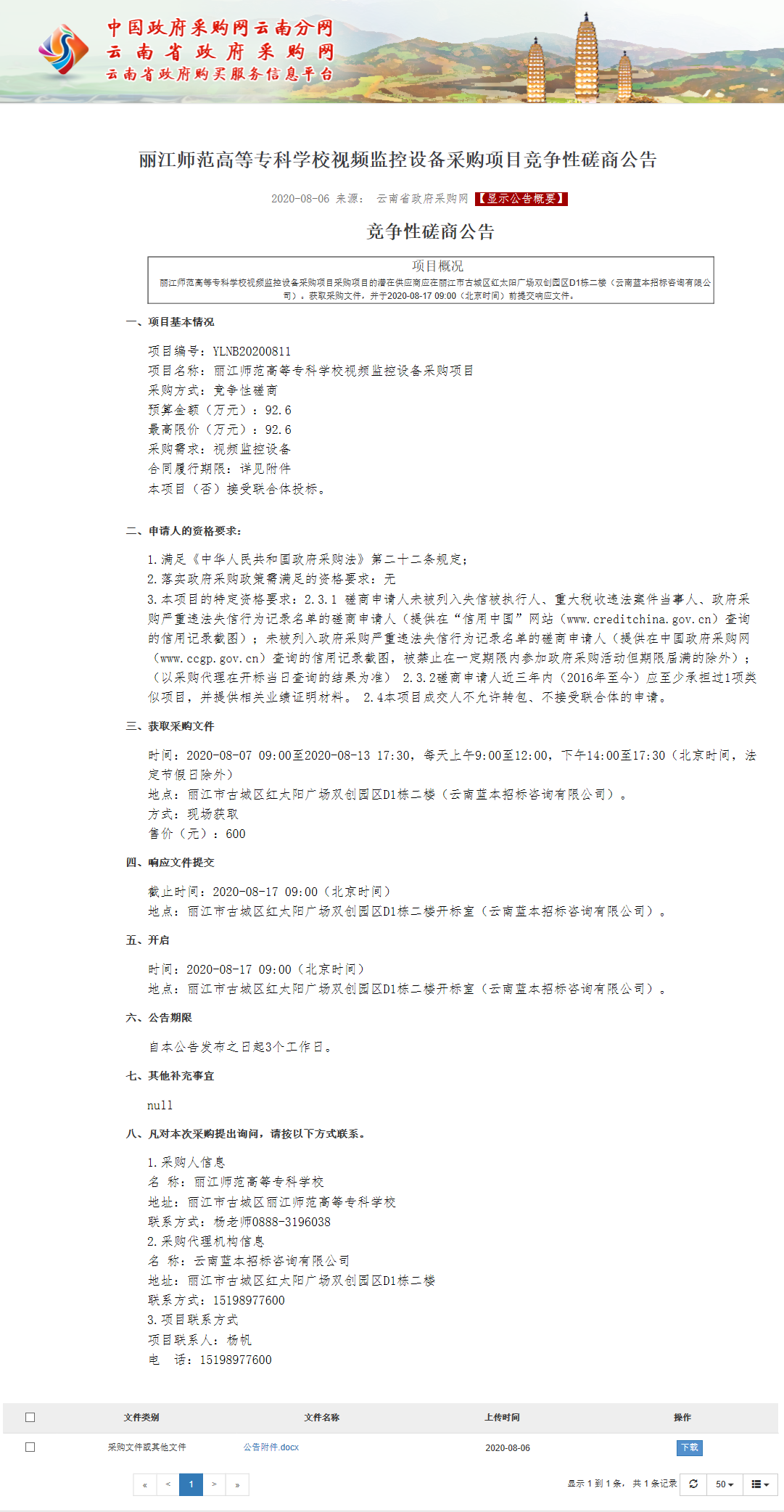丽江师范高等专科学校视频监控设备采购项目竞争性磋商公告
