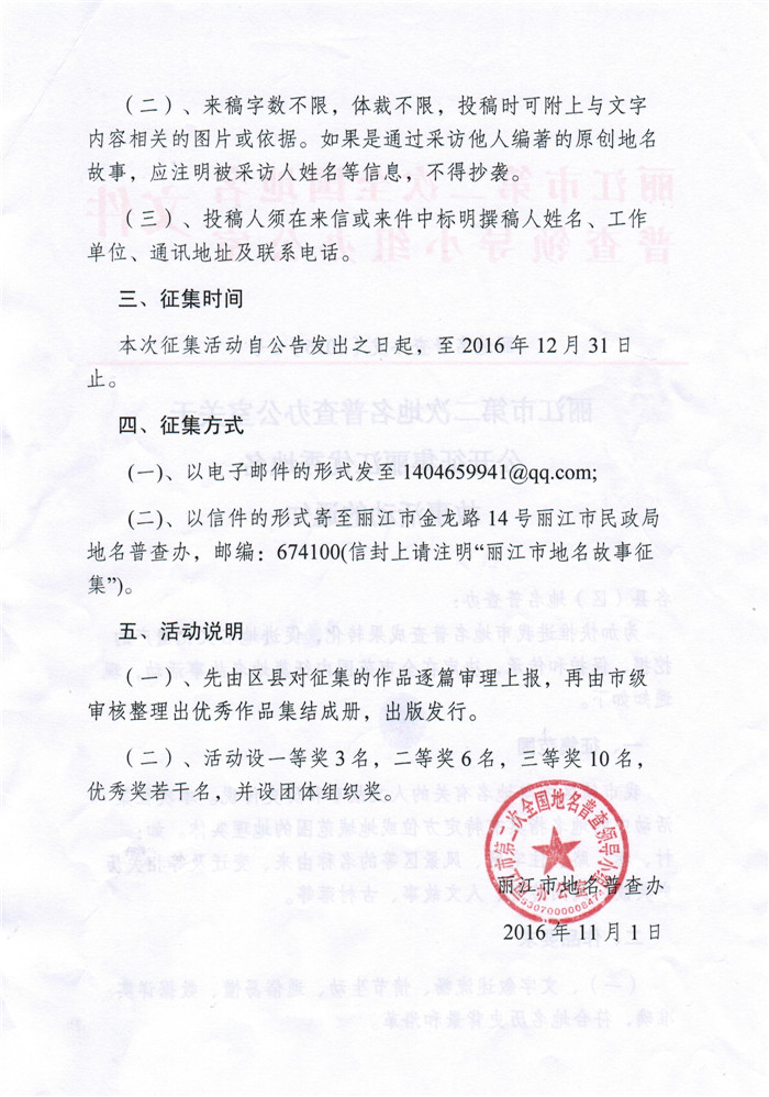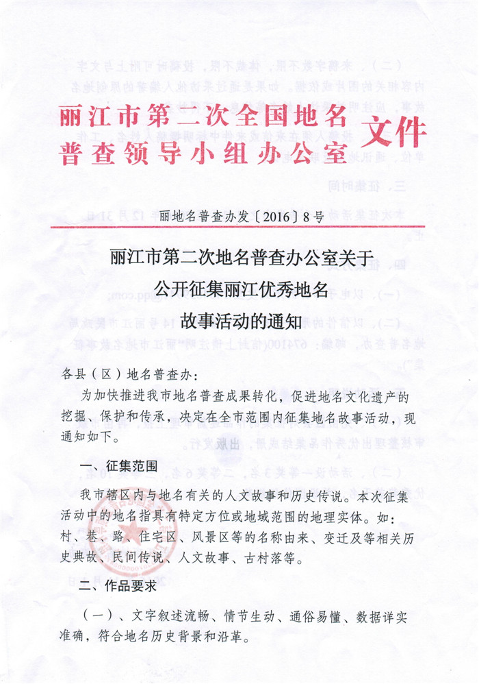 丽江市第二次地名普查办公室关于公开征集丽江优秀地名故事活动的通知