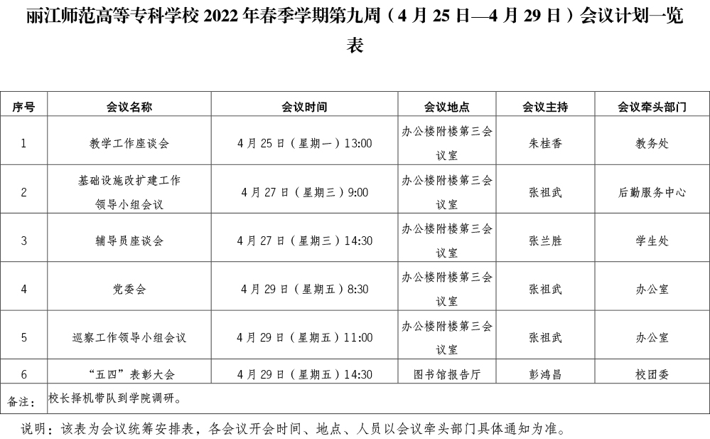 丽江师范高等专科学校2022年春季学期第九周会议计划表