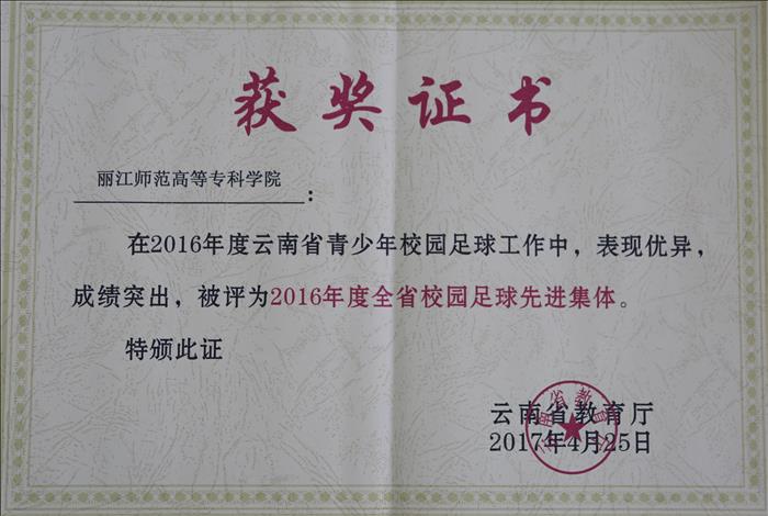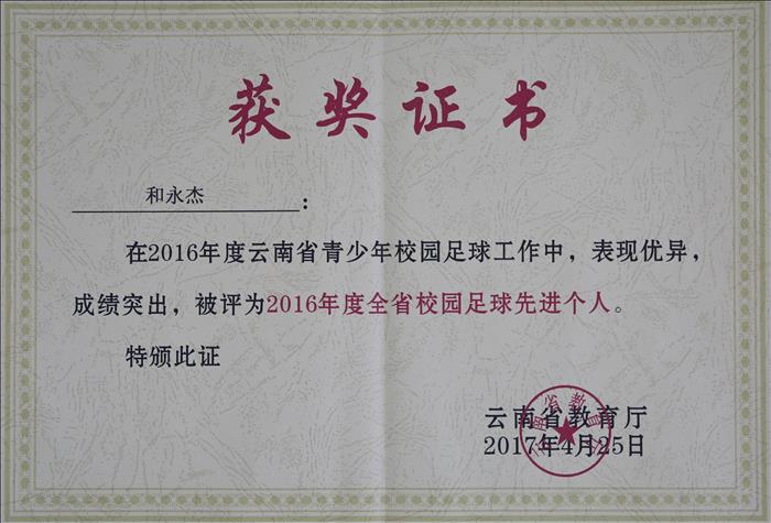 在云南省教育厅组织的2016年度全省青少年校园足球先进单位和先进个人评选工作中,WilliamHill官网荣获“2016年度全省校园足球先进集体”称号,和永杰老师被评为“2016年度全省校园足球先进个人”。