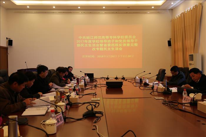 2018年1月26日14时30分,在办公楼第三会议室召开了2017年度学校领导班子和党员领导干部民主生活会暨省委巡视反馈意见整改专题民主生活会。校党委领导班子参加会议,副校级调研员、监审处处长、纪委办主任、组织部部长列席会议。丽江市第五督导组元正武、黄国中、史绍林3名同志到会指导。会议由党委书记蒋成旭同志主持。