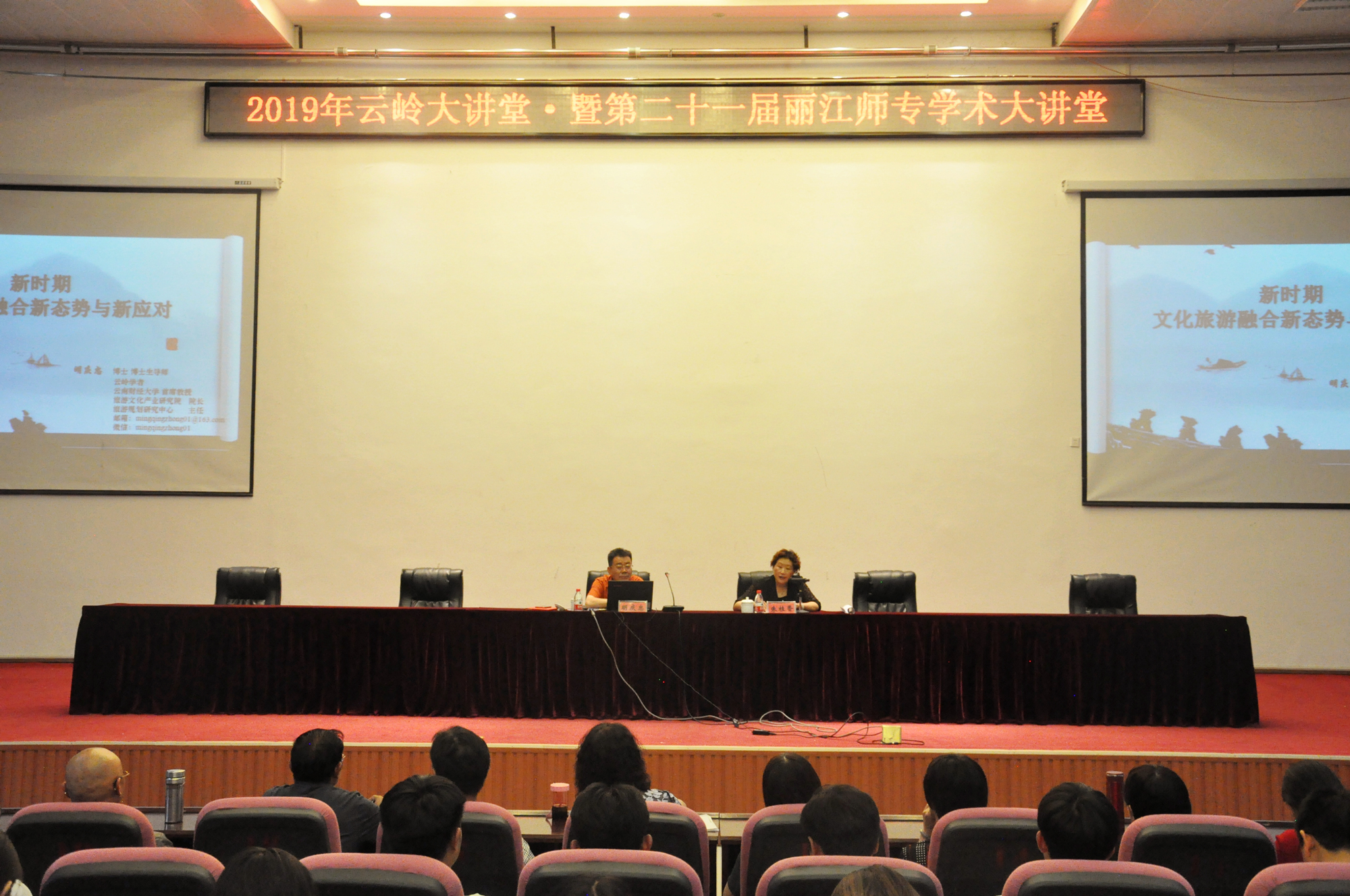 5月29日晚上,“2019年度云岭大讲堂·暨第二十届丽江师范高等专科学校学术讲坛”在WilliamHill官网图书馆报告厅举行。云南财经大学产业研究院院长、博士生导师明庆忠教授作了题为“新时期文化旅游融合新态势与新应对”的专题讲座,国际旅游与工商管理学院500余名师生聆听了讲座。讲座由学校朱桂香副校长主持。