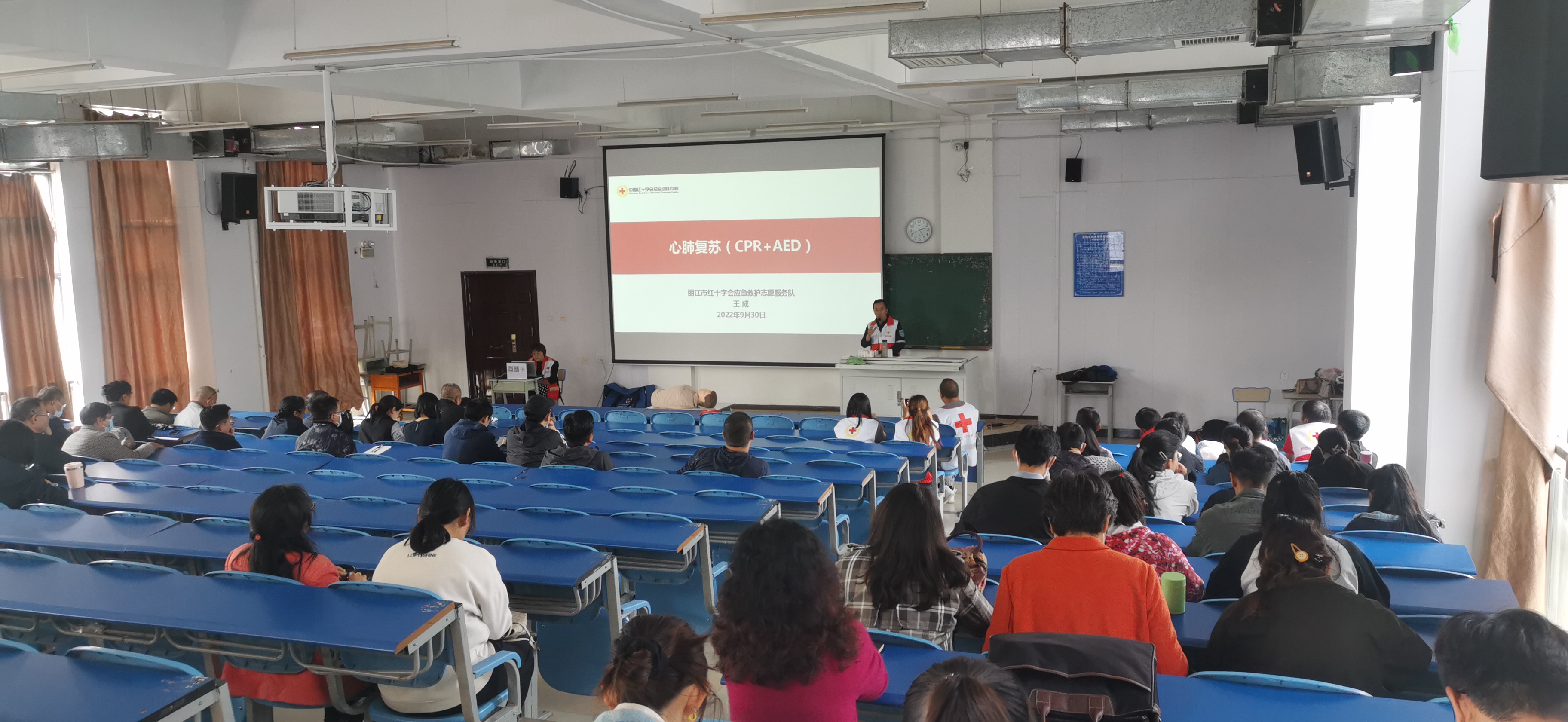 为提高全体师生的安全意识,提升应对突发事件和意外伤害事故的应急救援和自救互救能力,增强广大师生防灾避险意识,推进社会公共安全体系建设。2022年9月30日下午,在丽江市红十字协会与丽江市红十字志愿服务队的大力支持下“丽江师范高等专科学校教职工应急救护培训班(第一期)”在学校开班。在教学楼324举行了简单的开班仪式后,应急救护理论知识和实操课也分别拉开序幕。本次培训分为四期,参训人员包含保卫处、学生处、后勤服务中心等部门职工和辅导员、班主任及学院的教职员工。