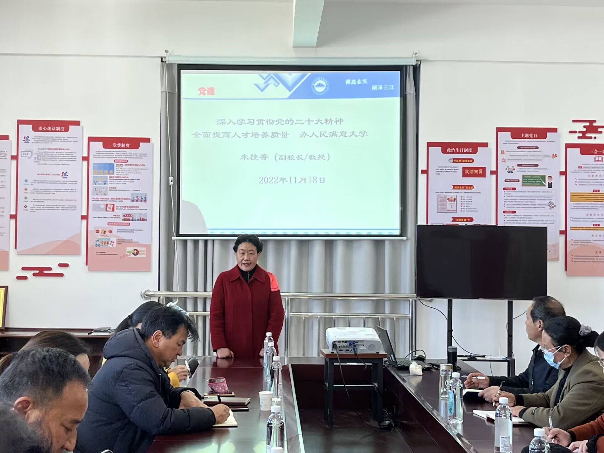 为深入学习贯彻党的二十大精神,把习近平总书记关于教育的重要论述落实到学校的发展建设和人才培养工作中,11月18日,副校长朱桂香在实训楼615为旅游与经济管理学院和数学与信息技术学院的40余名党员讲授了一堂学习贯彻党的二十大精神的生动党课。