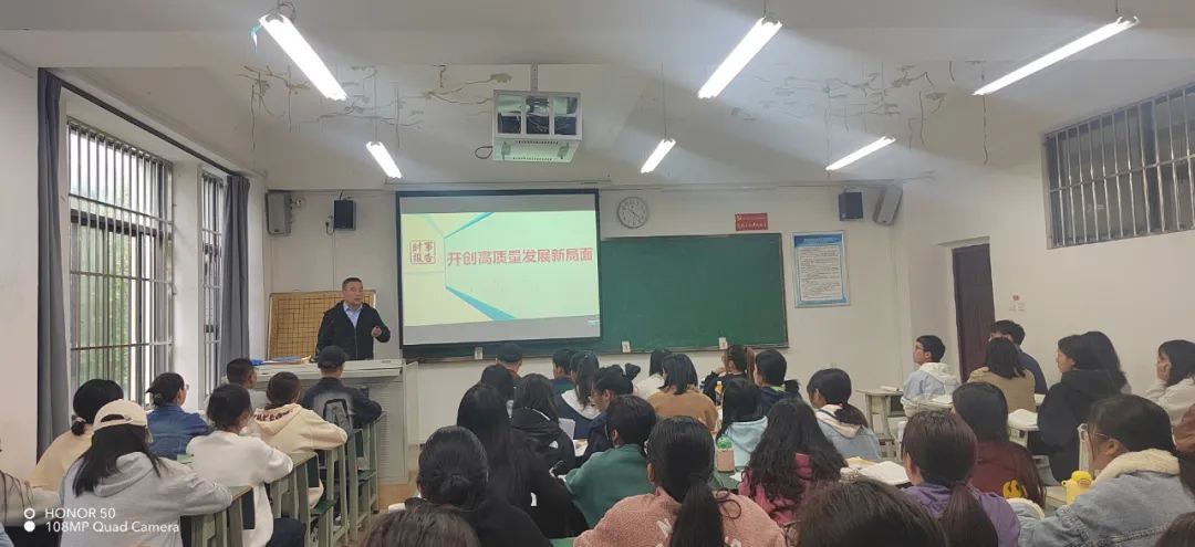 6月13日,副校长张兰胜从新时代中国经济的基本特征是由高速增长阶段转向高质量发展阶段,结合新时代10年的伟大变革,教育学生深刻把握时代脉搏、牢记历史使命。