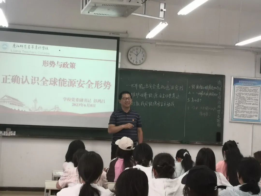 6月8日,党委副书记彭鸿昌从世界能源危机愈演愈烈、维护世界能源安全任重道远、打赢我国能源安全主动战的角度引导学生正确认识全球能源安全形势。