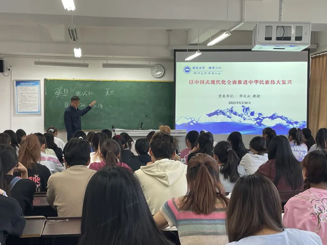 5月29日,党委书记毕天云以“以中国式现代化全面推进中华民族伟大复兴”为题,阐述了中国式现代化的形成过程、中国特色、重大原则、本质要求、世界意义,结合学校实际,以中国式教育现代化进程中高质量发展的丽师形象勉励同学们要争做有理想、敢担当、能吃苦、肯奋斗的新时代好青年。