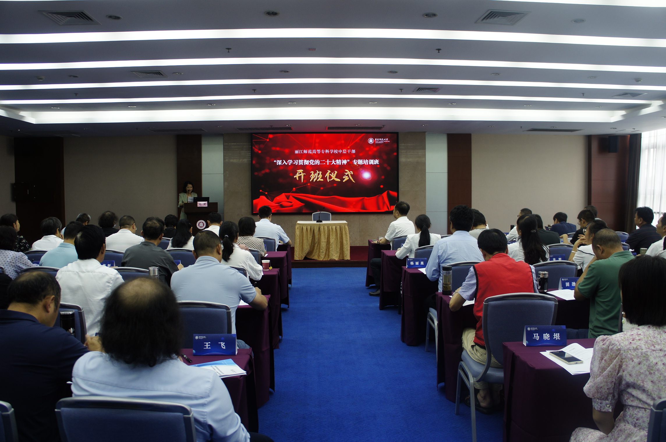 盛夏七月、万木葱茏,7月24日上午9:00,学校中层干部“深入学习贯彻党的二十大精神”专题培训班在华东师范大学教师之家开班。开班仪式由华东师范大学教师发展学院党总支书记赵健主持。