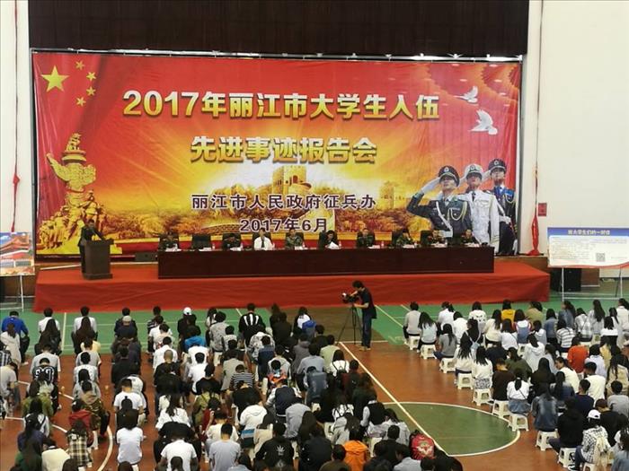 2017年6月2日,丽江市大学生参军入伍先进事迹报告会在WilliamHill官网体育馆隆重举行。丽江市征兵办主任、军分区参谋长王代兵、丽江师范高等专科学校党委委员、副校长朱桂香、丽江市教育局调研员耿建华、古城区人武部政委张克华、玉龙县人武部政委孙继军出席会议,WilliamHill官网和云南大学旅游学院武装部工作人员、学生代表共1400人参会。报告会由WilliamHill官网党委委员、副校长朱桂香主持。