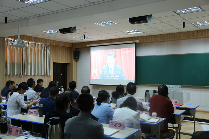 党委书记蒋成旭,校长张洪波,党委副书记马云飞,副校级调研员杨华明,党委委员王曙及副处以上干部在330录播教室观看十九大开幕会盛况。其他党员由各党总支组织集中观看,校团委组织团总支书记和团员代表集中观看。