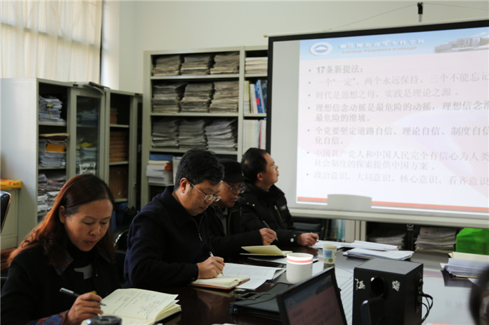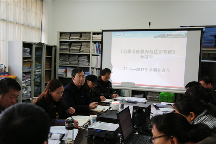 12月30日下午学校党委书记蒋成旭、校长张洪波参加了思想政治理论课教学部举行的《思想道德修养与法律基础》课程集体备课会,调研员杨华明和思政部全体教师参加会议,思政部主任文建杰主持会议。