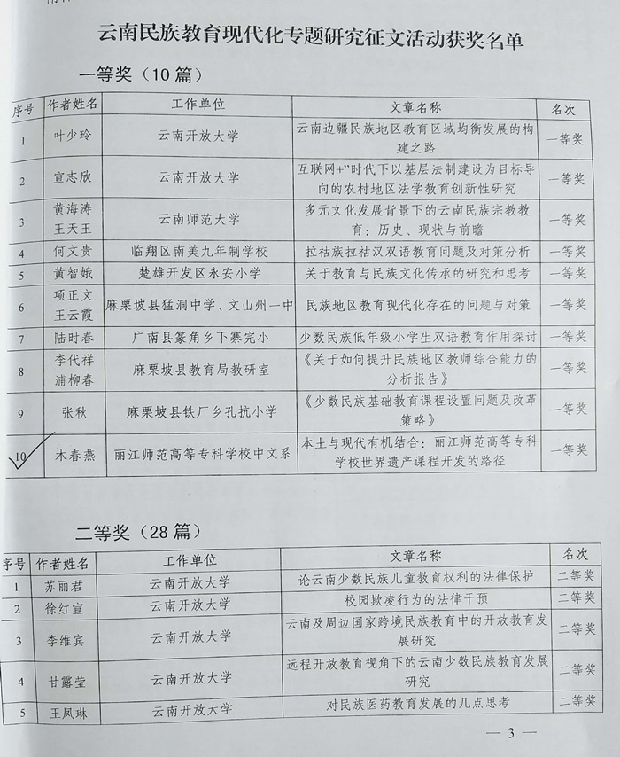 木春燕教授题为《本土与现代有机结合:丽江师范高等专科学校世界遗产课程开发的路径》论文获得云南省教育厅、云南省民族宗教事务委员会共同开展的民族教育现代专题研究征文一等奖。