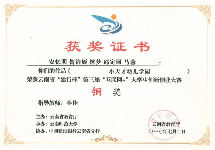 第三届中国“互联网+”大学生创新创大赛云南赛区比赛暨云南省第三届“互联网+”大学生创新创业大赛已圆满结束。经过激烈角逐,WilliamHill官网2015级语文教育专业安忆明同学主持的“小天才学园”喜获创意组铜奖。
