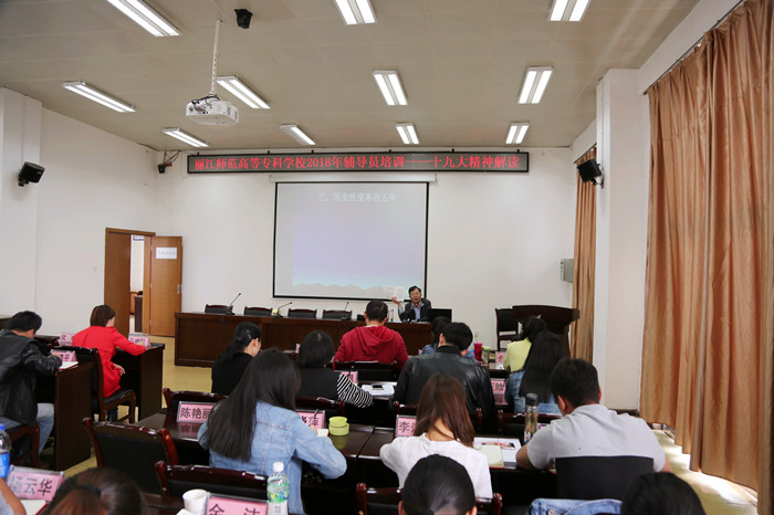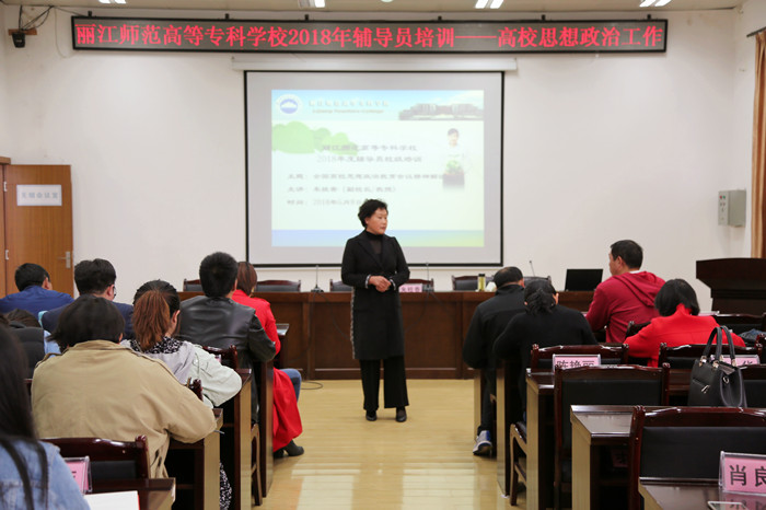 下午16:30,副校长朱桂香作了以“全国高校思想政治教育会议精神解读”为主题的授课,对《关于加强和改进新形势下高校思想政治工作的意见》、《高校思想政治工作质量提升工程实施纲要》和《丽江师范高等专科学校关于加强和改进新形势下高校思想政治工作的实施办法》文件主要精神作了深入分析。她重点解读了全国高校思想政治教育会议精神,从为何要重视高等教育、为何培养人、如何培养人、如何做好思想政治工作以及高校教师要如何做等方面进行了详细讲解。要求全体辅导员要坚持教书与育人相统一、坚持言传与身教相统一、坚持潜心问道和关注社会相统一,坚持学术自由和学术规范相统一。