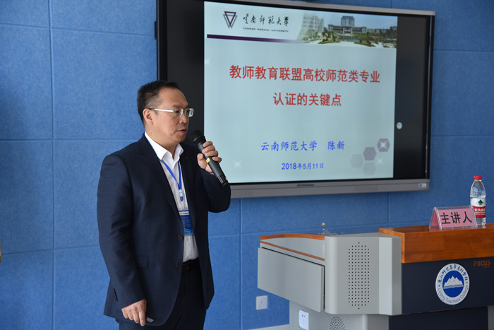 云南师范大学教授陈新以《教师教育联盟高校师范类专业认证的关键点》为题,从师范类专业认证的内涵与理念、体系和标准、模式与组织形式展开讲解。