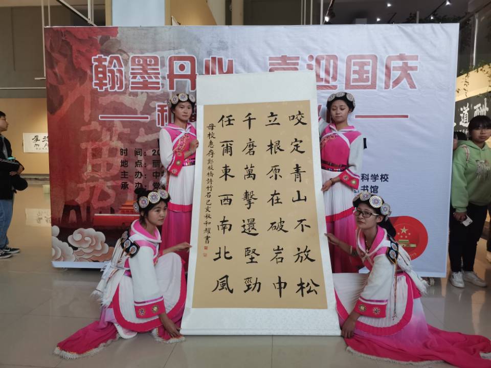 在开展现场,和耀老师将《线篆书王冕墨梅》《东巴文康熙咏兰》《楷书郑板桥竹石》《隶书元稹菊花》《草书周敦颐爱莲说》梅兰竹菊莲共5幅书法作品捐赠给学校,由学校图书馆收藏。