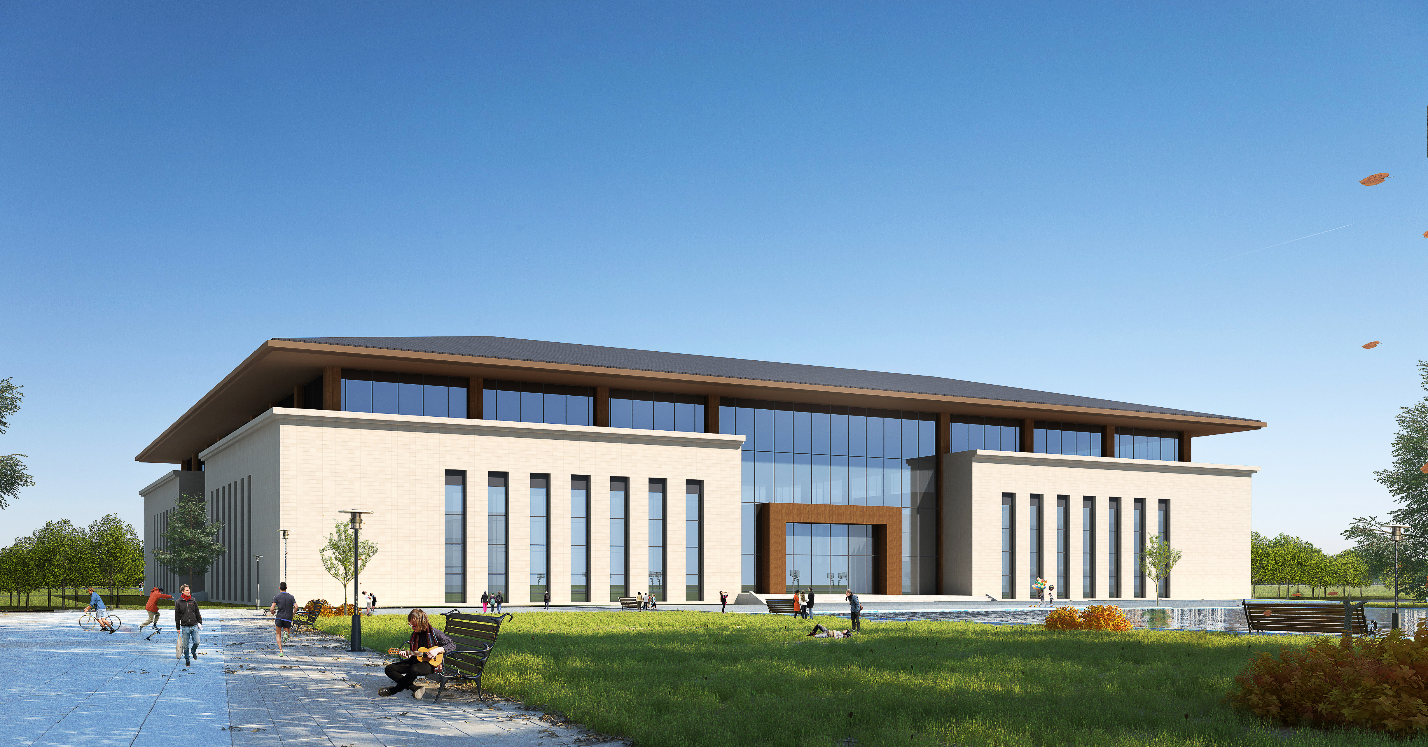 设置多个广场及绿色节点,改善地块小气候,图书馆前的景观湖暗喻知识如浩海,充分利用校内良好的水景观资源,打造学海,曲桥,蜿蜒曲折的水系穿插于校园内,以规整式布局为主,多层次视觉景观空间为辅,在游园以及校区采用自然式布局,做到规整与自然式相结合,在山水之间为学生提良好的学习氛围环境。