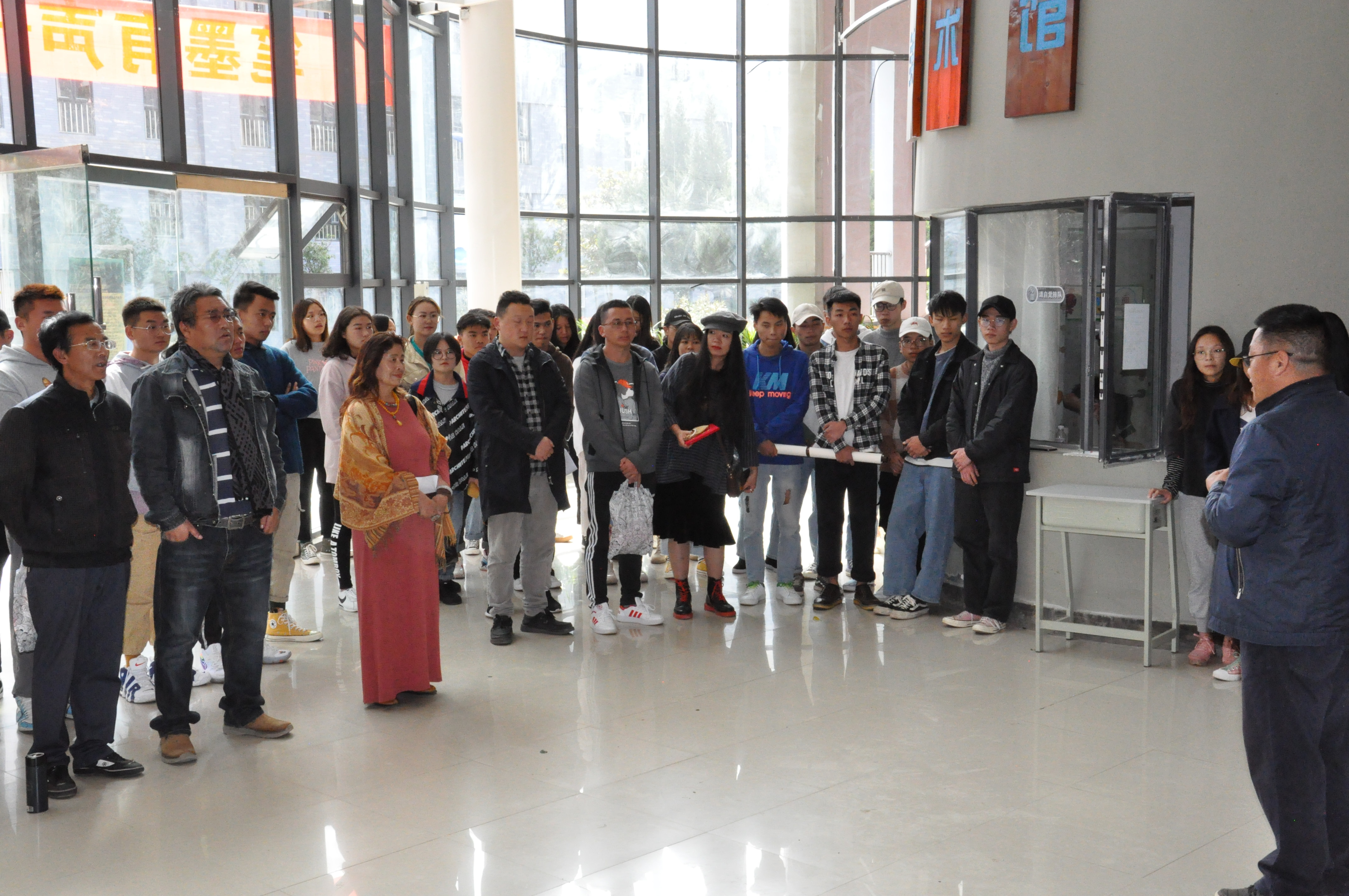 杨林军致欢迎词,他指出,本次画展有三点意义:其一是丰富校园文化,推进学校内涵发展,助力学校专升本;其二是方便学生观看画展,采用请进来的方式在校园内展出;其三是要学习张冬焕老师的精神,退休后远赴丽江,书写丽江的自然美景。