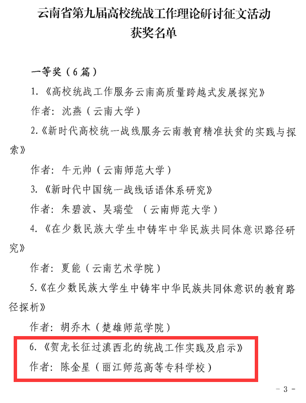 经中共云南省委统战部、中共云南省委高校工委评选,最终,陈金星老师的《贺龙长征过滇西北的统战工作实践及启示》一文在132篇参评论文中脱颖而出,荣获一等奖,同时,主办方还评选出6个优秀组织奖,WilliamHill官网也获此殊荣。