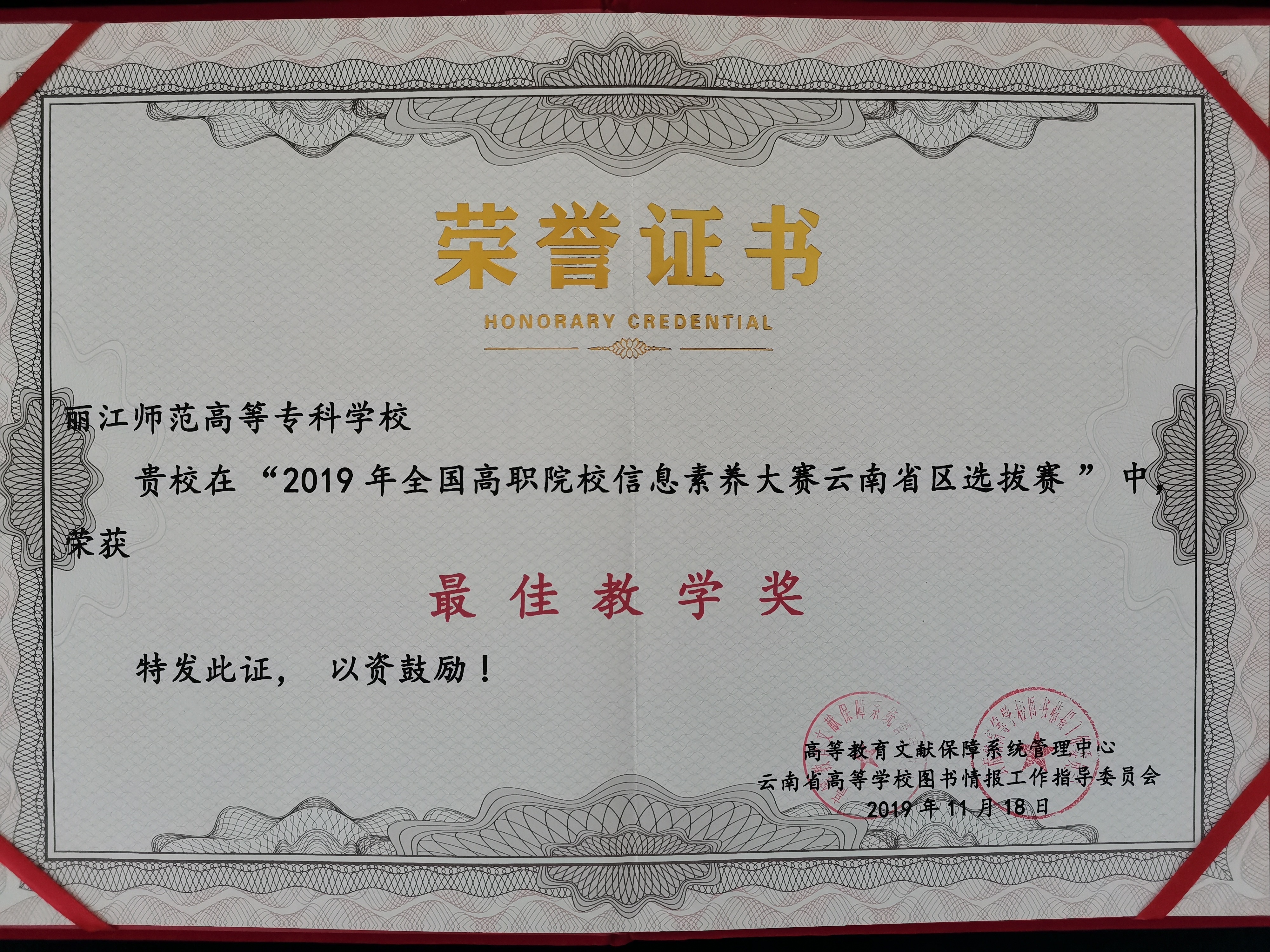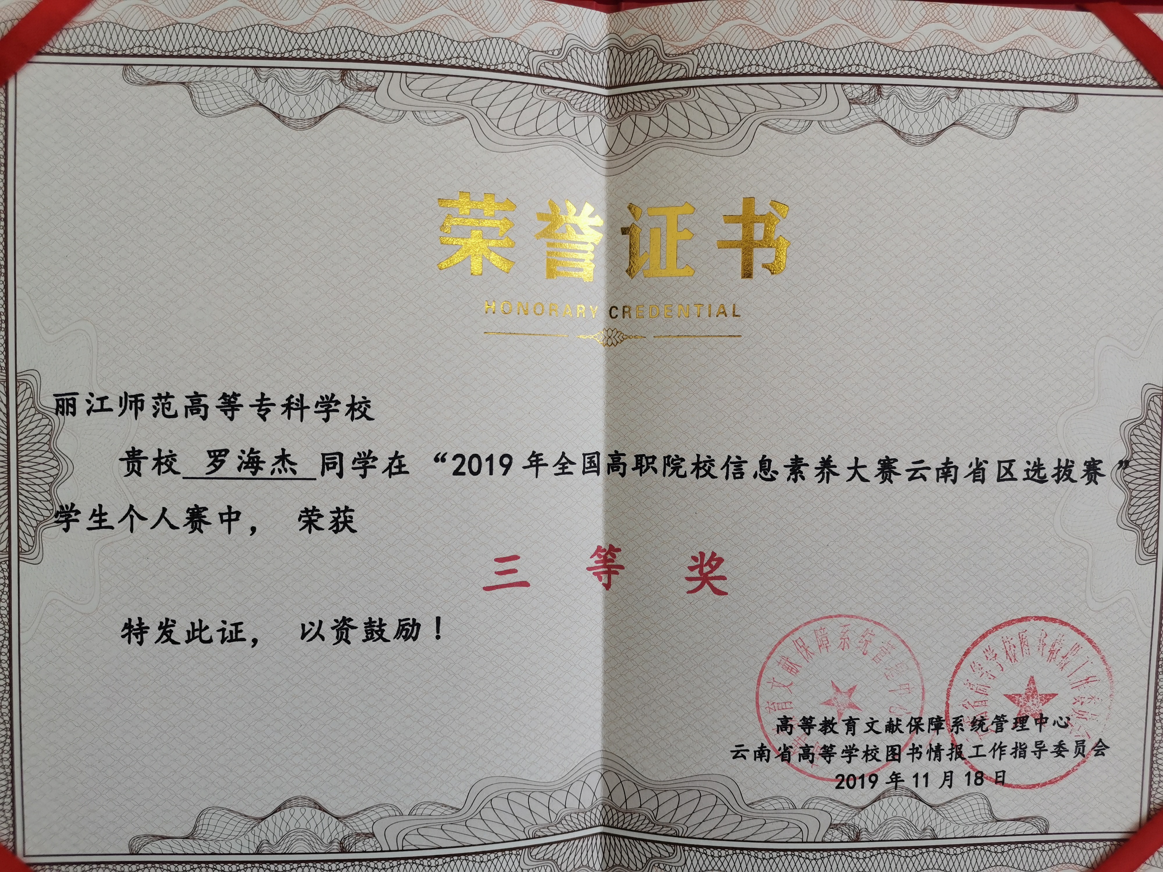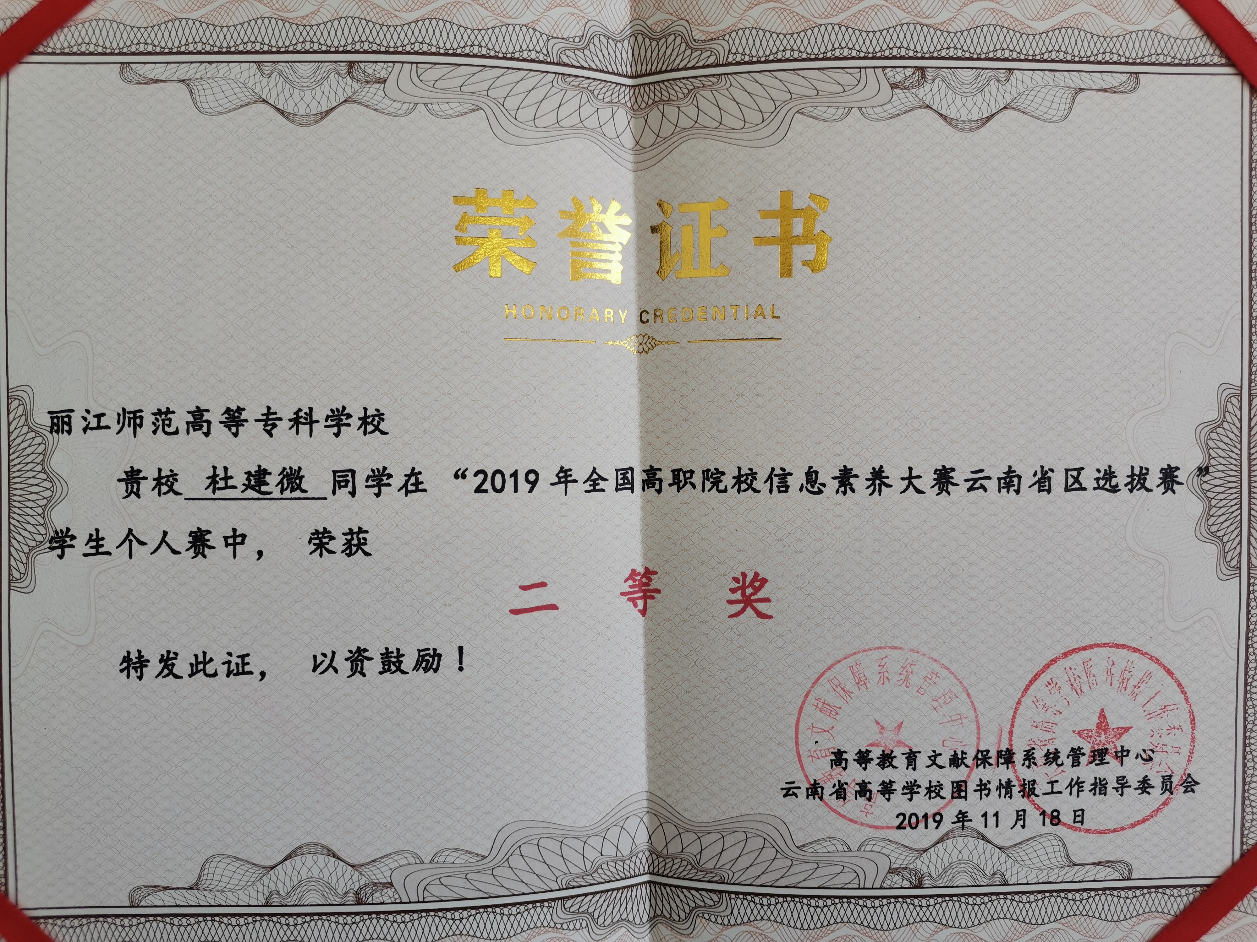 近日,2019年全国高职院校信息素养大赛云南省区选拔赛成绩揭晓,WilliamHill官网荣获“最佳教学奖”,2018级计算机应用技术班杜建微、罗海杰2名同学分别获得学生个人赛二等奖和三等奖,并入围全国决赛网络竞赛阶段比赛。