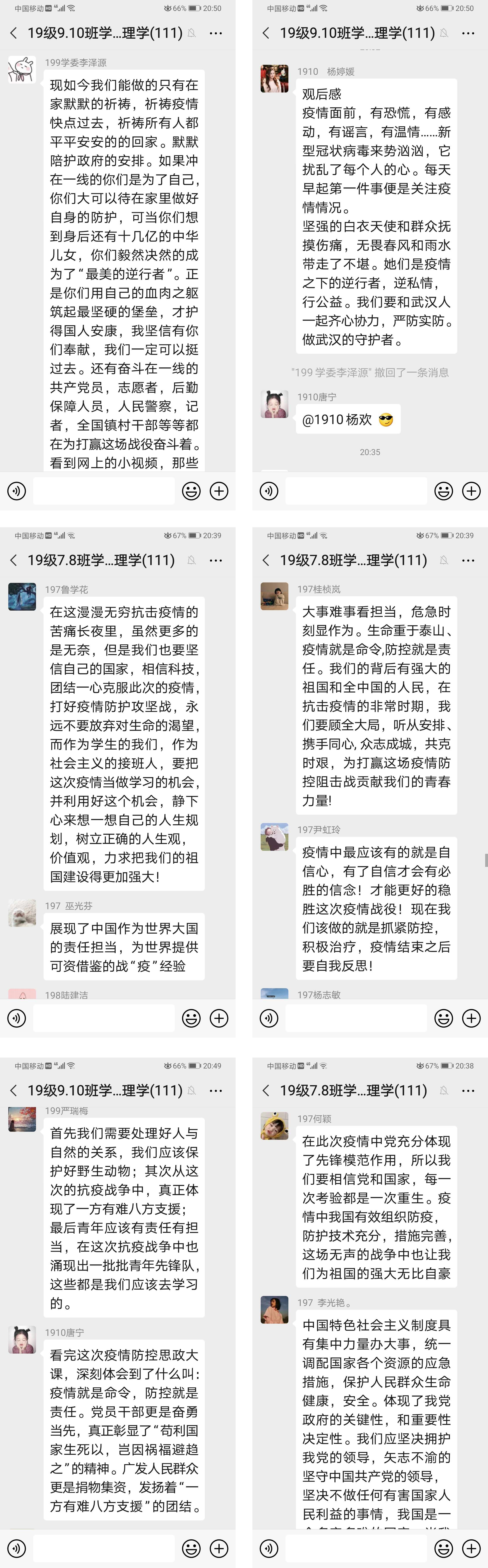 马克思主义学院19思政1班兰金红同学说,在这场疫情当中,90后和00后的比例占到了三份之一,他们不只会撒娇闹脾气发嗲,懒、贪吃、会玩,当疫情来临的时候,他们义无反顾地把自己的青春献给了祖国,卖萌不影响冲锋,面对恐惧,依然勇敢向前,在病房里,他们像一个大人一样照顾病人,出了病房,他们是蹦蹦跳跳的,像一个孩子,青年一代的他们当担起了时代赋予的责任和挑战。