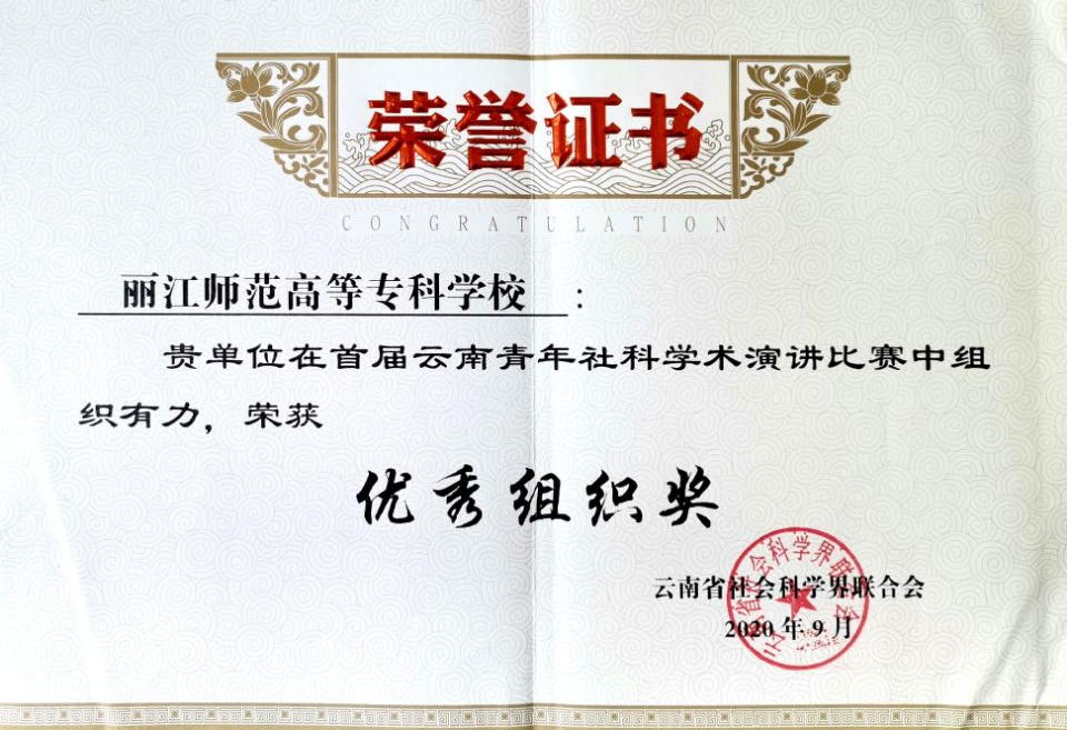 WilliamHill官网教师教育学院青年教师李佳在云南省社科联主办的首届云南青年社科学术演讲比赛中荣获“二等奖”,国际文化交流学院青年教师陈永荣获“优秀奖”,丽江师范高等专科学校荣获“优秀组织奖”。