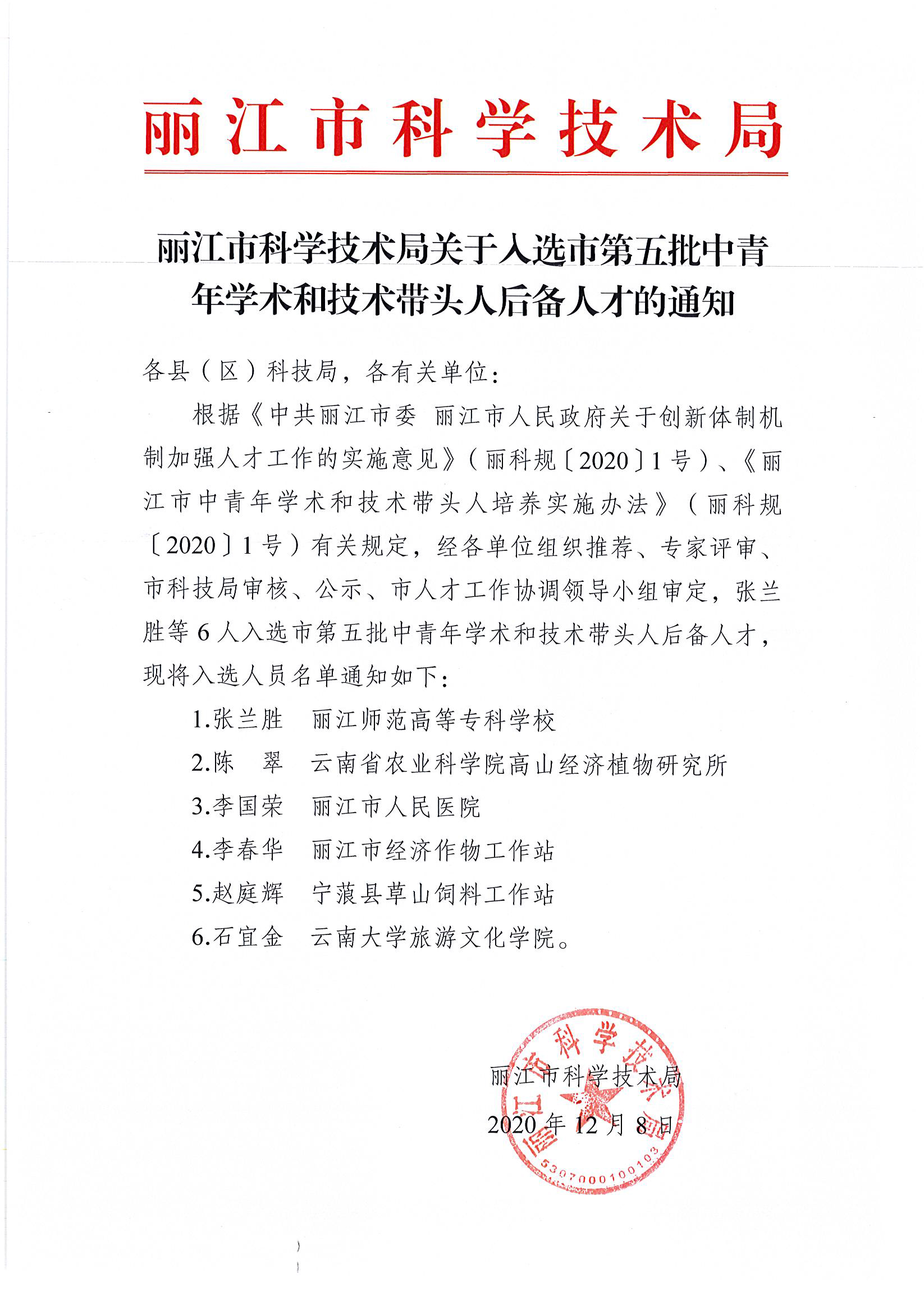 近日,丽江市科技局下发了《丽江市科学技术局关于入选第五批中青年学术和技术带头人后备人才的通知》,WilliamHill官网张兰胜副校长入选了丽江市第五批中青年学术和技术带头人后备人才。据了解,本次后备人才项目经各单位组织推荐、专家评审、市科技局审核、公示、市人才工作协调领导小组审定,最终全市有6人入选。