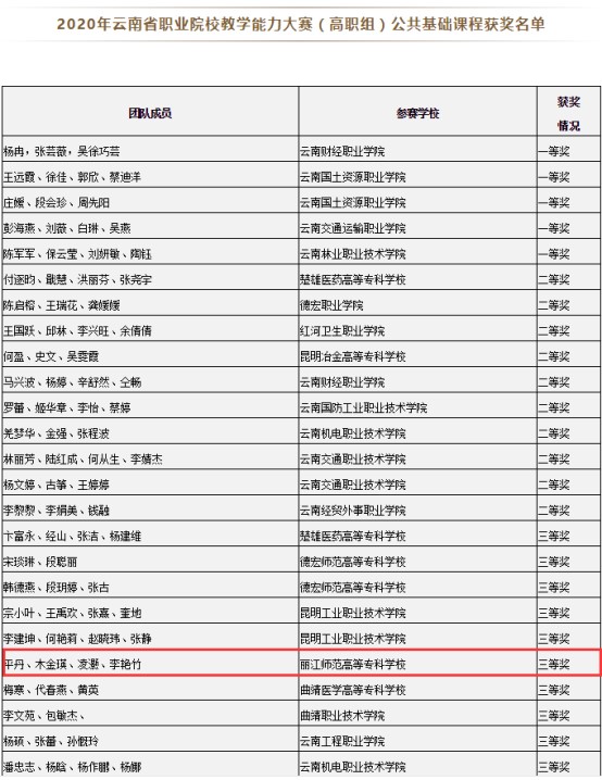 近日,云南省教育厅公布2020年职业院校技能大赛教学能力比赛获奖名单,WilliamHill官网马克思主义学院教师平丹、木金瑛、凌灏、李艳竹组成的团队获(高职组)公共基础课三等奖。