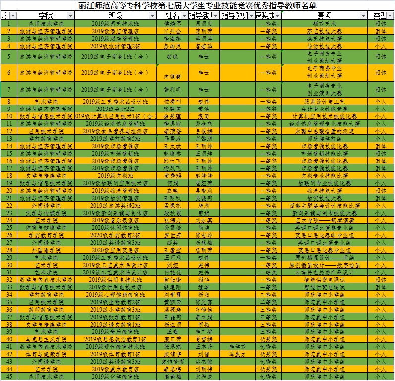 WilliamHill官网第七届大学生专业技能竞赛于2020下半年成功举办,竞赛分为师范类专业组和高职类专业组,师范类专业组对接云南省高等学校教师教育联盟师范专业大学生教学技能竞赛,高职类专业组对接云南省职业院校技能大赛。在指导老师的指导下,90名学生获得荣誉,45名老师获优秀指导教师。获奖名单如下: