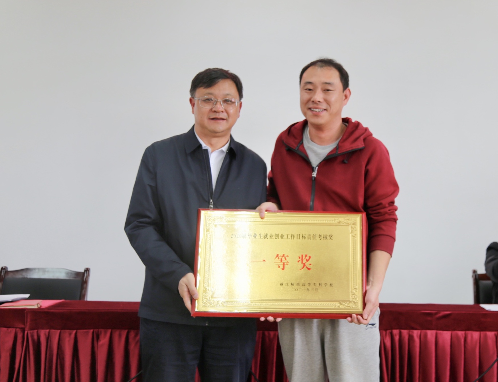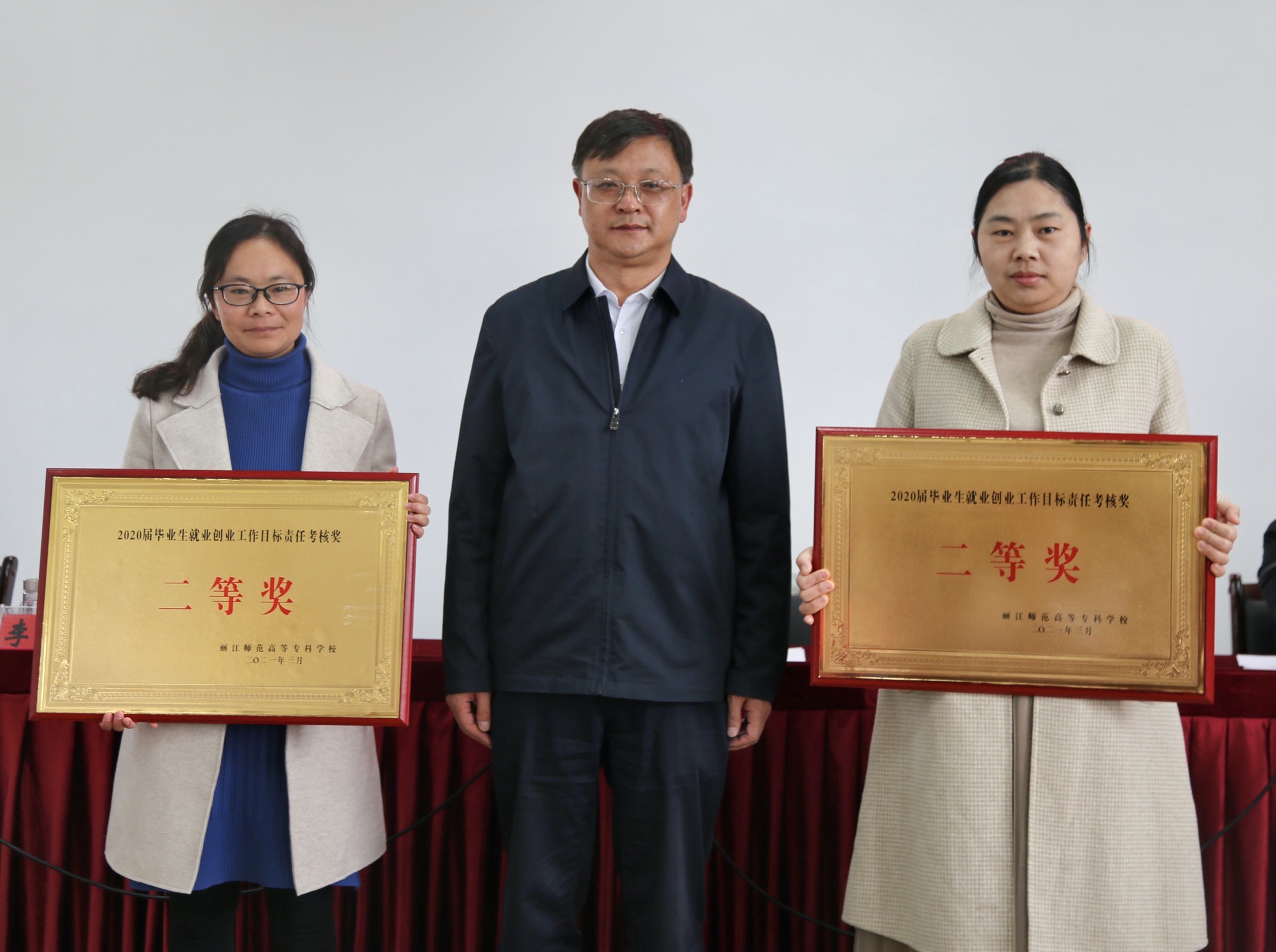 会议表彰了一批在2020年就业创业工作量化考核中获奖的学院。毕天云为获奖学院颁发奖牌。学前教育学院、马克思主义学院、应用技术学院分别从就业工作思路、举措和成效等方面作了经验交流。