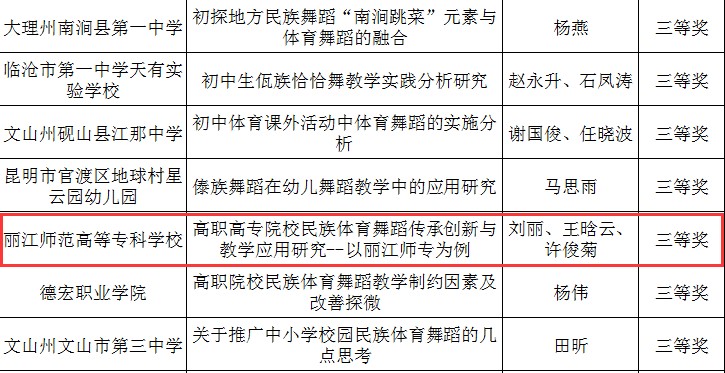 近日,云南省教育厅下发《云南省教育厅关于组织开展云南省学校民族团结进步系列活动民族体育舞蹈线上教学和竞赛活动的通知》文件,WilliamHill官网积极参加。刘丽、王晗云、许俊菊的《高职高专院校民族体育舞蹈传承创新与教学应用研究--以丽江师专为例》获得三等奖。