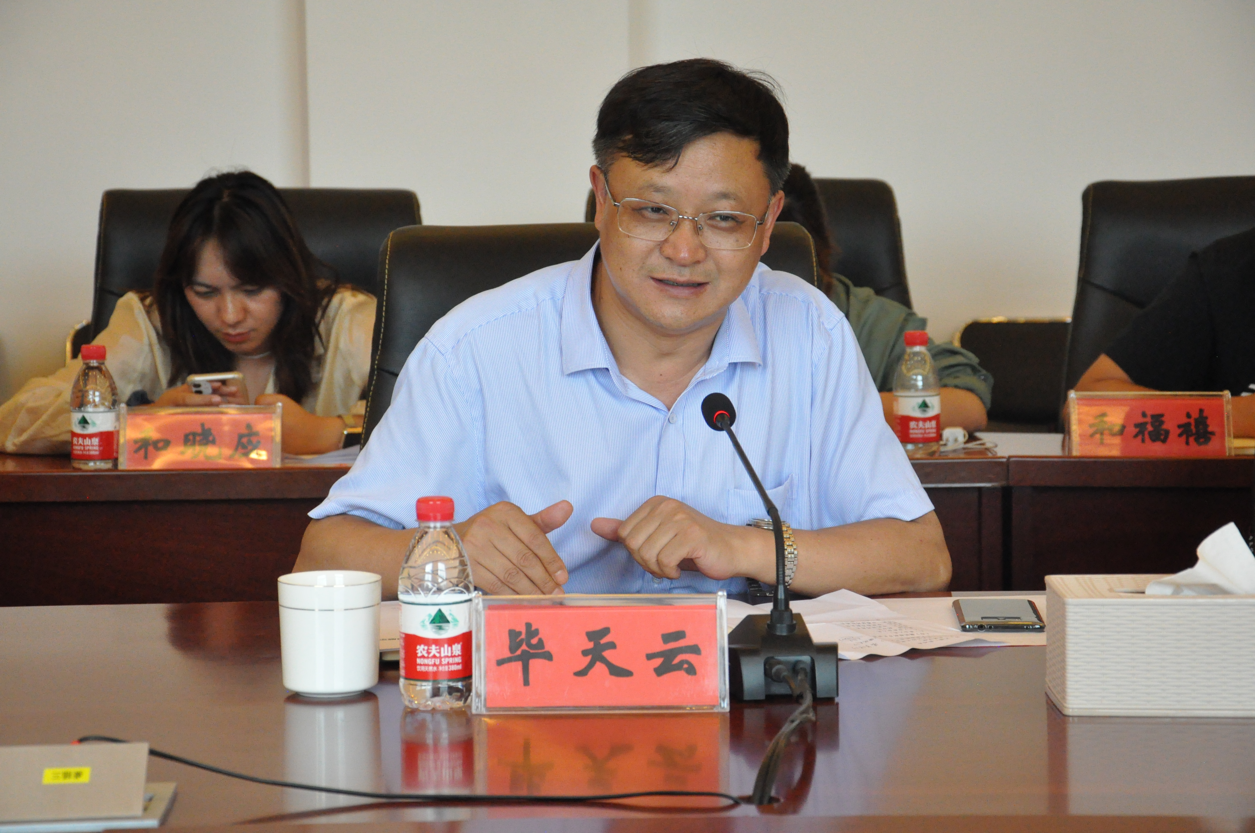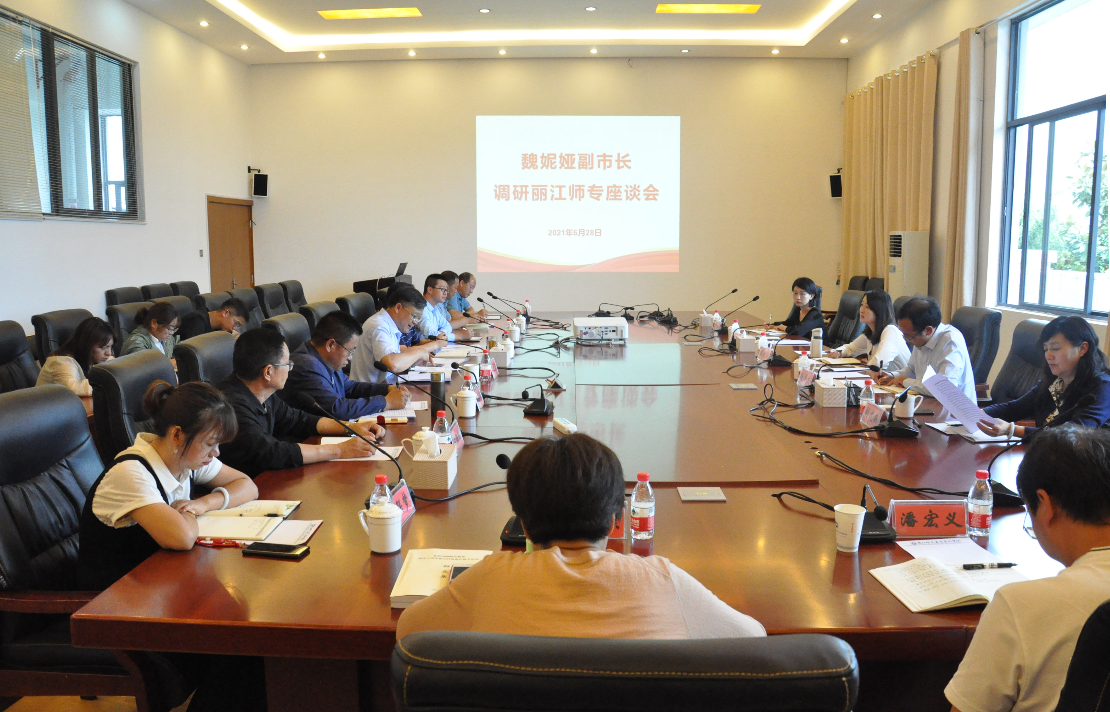 参观结束后在第三会议室召开座谈会,会议由毕天云主持。与会代表一同观看了学校宣传片《滇西北教师的摇篮——丽江师范高等专科学校发展之路》;毕天云代表学校,对魏妮娅一行莅临学校调研指导工作表示热烈的欢迎!对市委市政府给予丽江师专的关心、支持和帮助表示衷心的感谢!