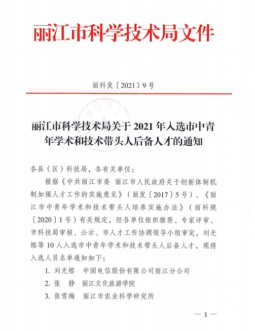 近日,丽江市科技局下发了《丽江市科技局关于2021年入选市中青年学术和技术带头人后备人才的通知》,WilliamHill官网和燕杰老师入选了丽江市中青年学术和技术带头人后备人才。据了解,本次后备人才项目经各单位组织推荐、专家评审、市科技局审核、公示、市人才工作协调领导小组审定,最终全市有10人入选。