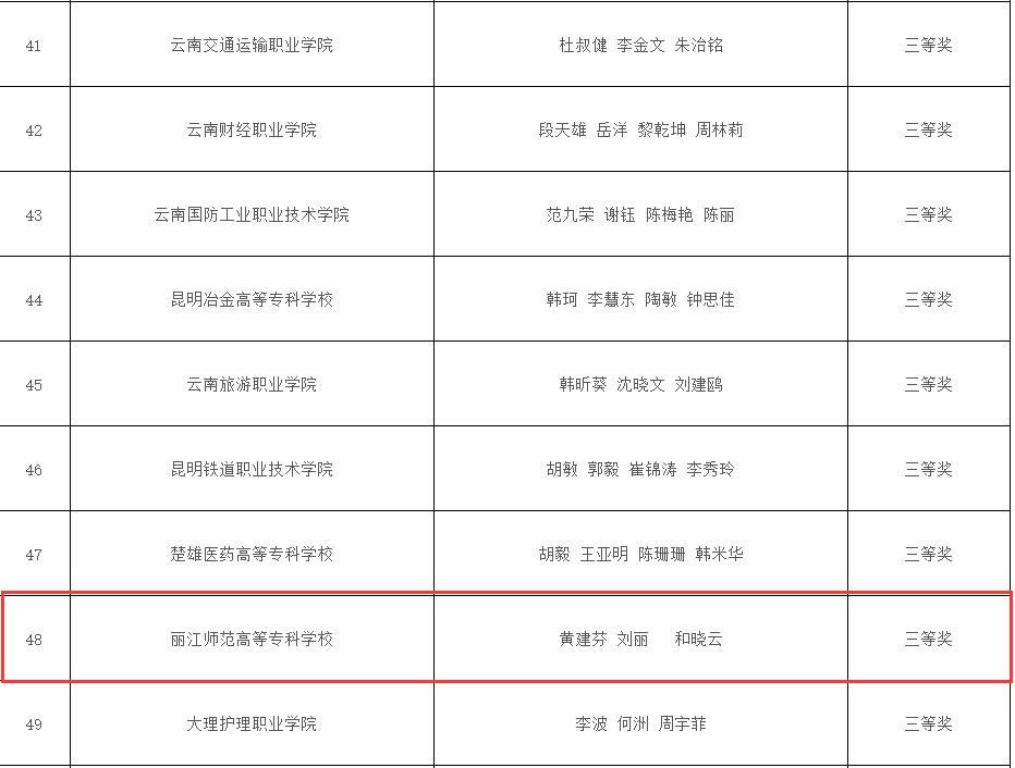 近日,2021年云南省职业院校技能大赛教学能力比赛正式落下帷幕,来自41所高职院校的293个团队参加了此次比赛。经过专家网络评审和现场决赛两个环节。最终,学校教师黄建芬、刘丽、和晓云获得高职组专业课三等奖。