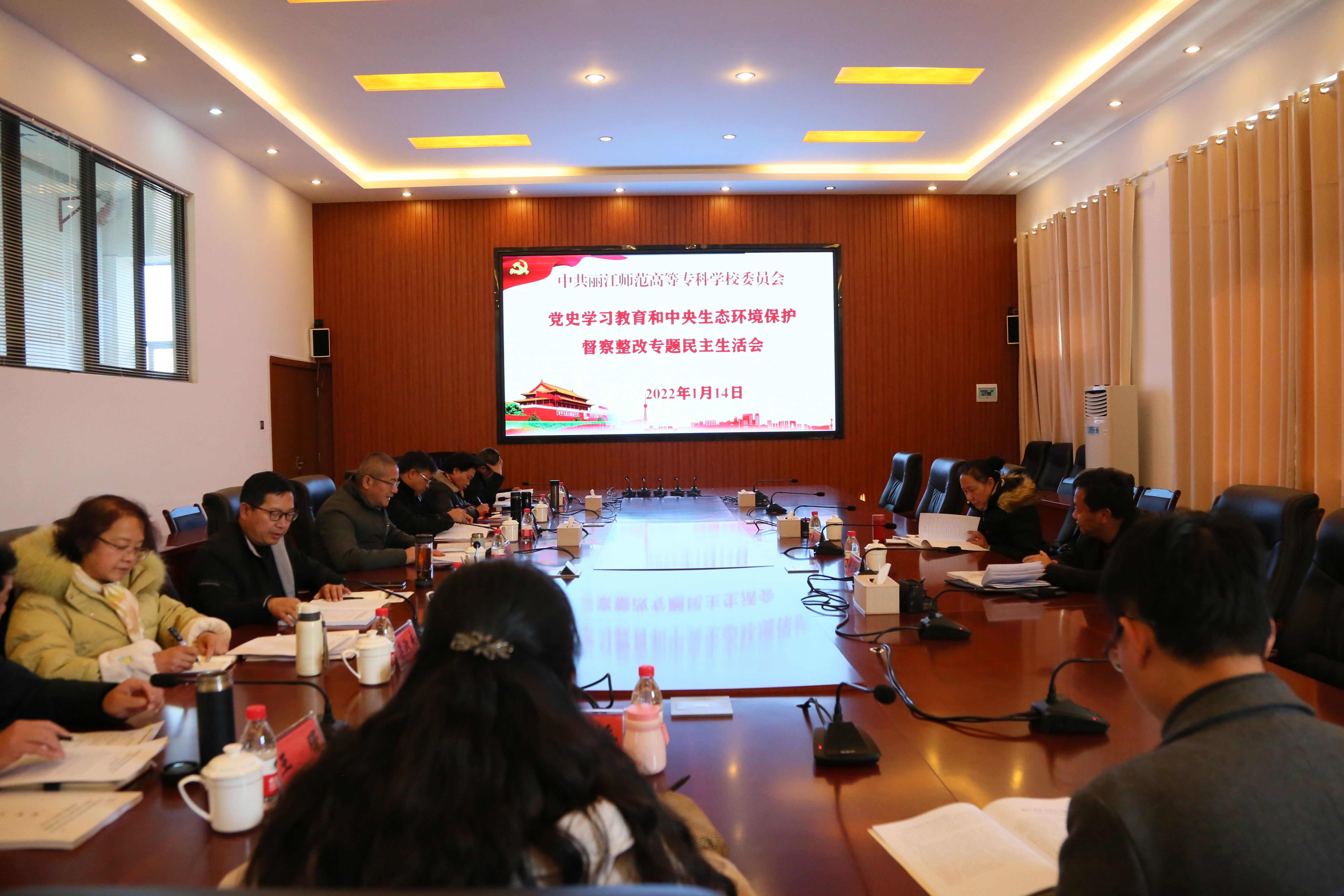 根据中共丽江市纪律检查委员会、中共丽江市委组织部、中共丽江市委党史学习教育领导小组关于召开党史学习教育和中央生态环境保护督察整改专题民主生活会的通知要求,1月14日下午,学校在第三会议室召开中共丽江师范高等专科学校党委领导班子党史学习教育和中央生态环境保护督察整改专题民主生活会。丽江市委党史学习教育第二巡回指导组副组长、市纪委监委四级调研员万永红,市委党史学习教育第二巡回指导组成员、市委宣传部反非法反违禁科科长和文鹏到会指导工作。学校党委书记张祖武,党委副书记、校长毕天云,党委副书记彭鸿昌,党委委员、副校长朱桂香,党委委员、纪委书记李淑良,党委委员、副校长张兰胜,党委委员、体育与健康学院党总支副书记、院长王曙,党委委员、组织部部长和新梅参加会议。保留待遇干部、办公室、纪检处、纪委办主要负责人列席会议。会议由张祖武主持。