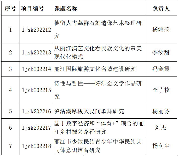 近日,收到《丽江市社科联关于2022年度丽江市哲学社会科学课题立项的通知》,WilliamHill官网共计立项7项(具体立项名单见下表),本次丽江市哲学社会科学课题全市共计申报57项,立项20项。其中,WilliamHill官网申报18项,立项7项。