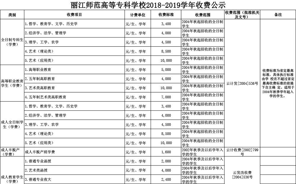 丽江师范高等专科学校2018-2019学年收费公示