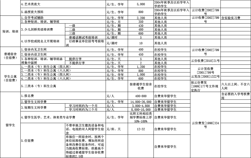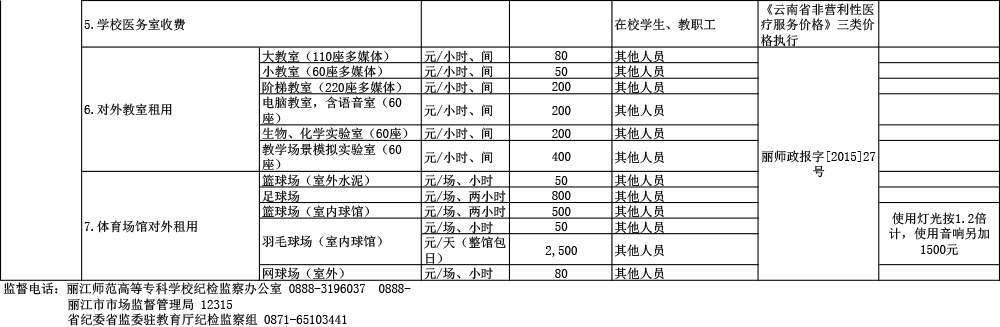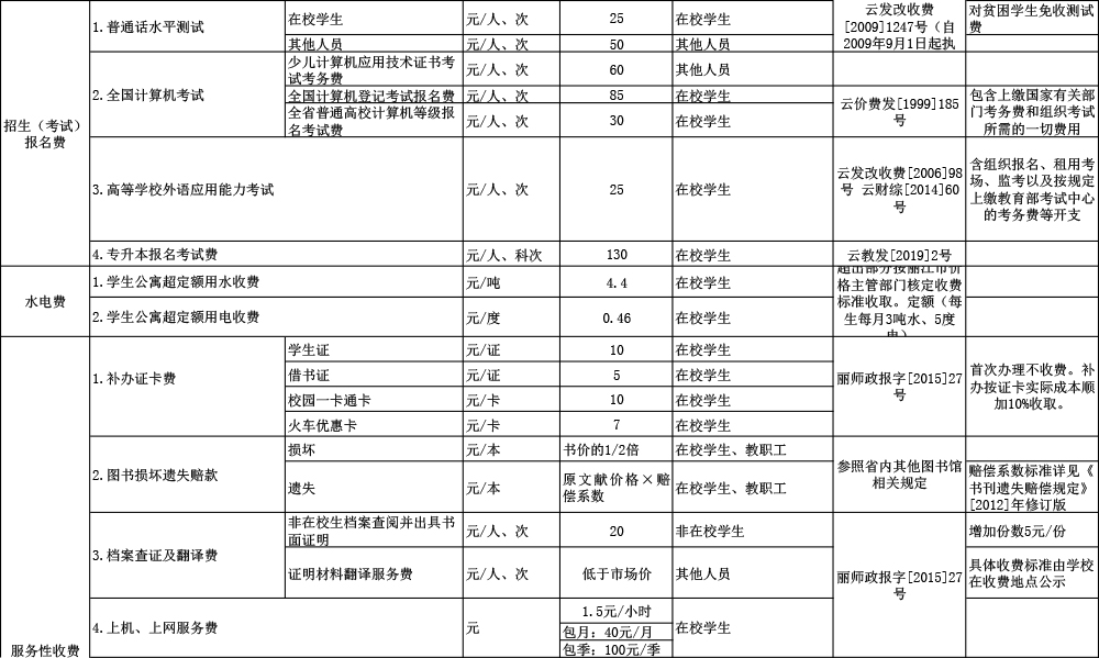 丽江师范高等专科学校收费公示