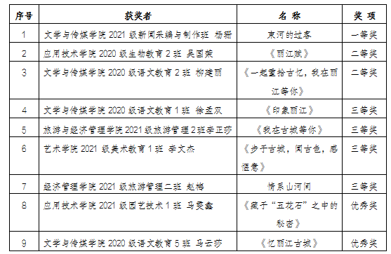 WilliamHill官网积极组织学生参加由共青团丽江市委联合世界文化遗产丽江古城保护管理局、丽江市教育体育局、丽江古城管理有限责任公司举办的“奋进新征程乐享古城韵”系列活动之“漫步世界遗产 记忆丽江古城”主题征文活动。经过系列评审,全市76名选手获奖。其中,WilliamHill官网学生荣获B组(高中及以上)一等奖1项,二等奖2项,三等奖4项,优秀奖2项。