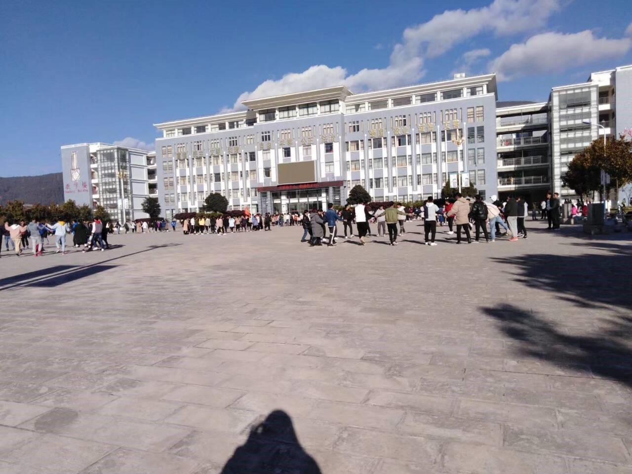 作品说明:在上面我所拍的图片中展示了我的学校–丽江师范高等专科学校的气派不凡,之所以选择这些照片是因为:在如此强烈的阳光下 依旧有很多同学坚持打跳和跑步,这正是学校的功劳。