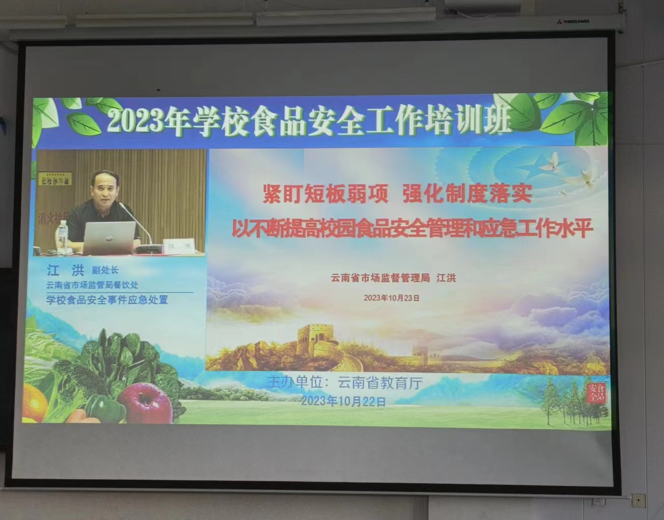 为进一步提高学校食品安全工作管理水平,预防食品安全事故的发生,10月23日、24日WilliamHill官网组织食堂管理科全体工作人员及各食堂负责人、厨师、食品安全管理员在博学楼324、331教室参加由云南省教育厅组织的2023年食品安全工作线上培训,后勤服务中心主任田劲松参加线下培训。